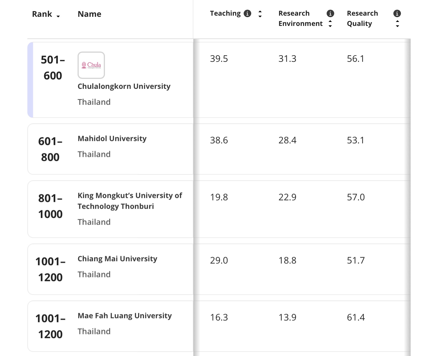 [Spoil] คลิกเพื่อดูข้อความที่ซ่อนไว้https://www.timeshighereducation.com/world-university-rankings/latest/world-ranking#!/length/25/locations/THA/sort_by/rank/sort_order/asc/cols/stats