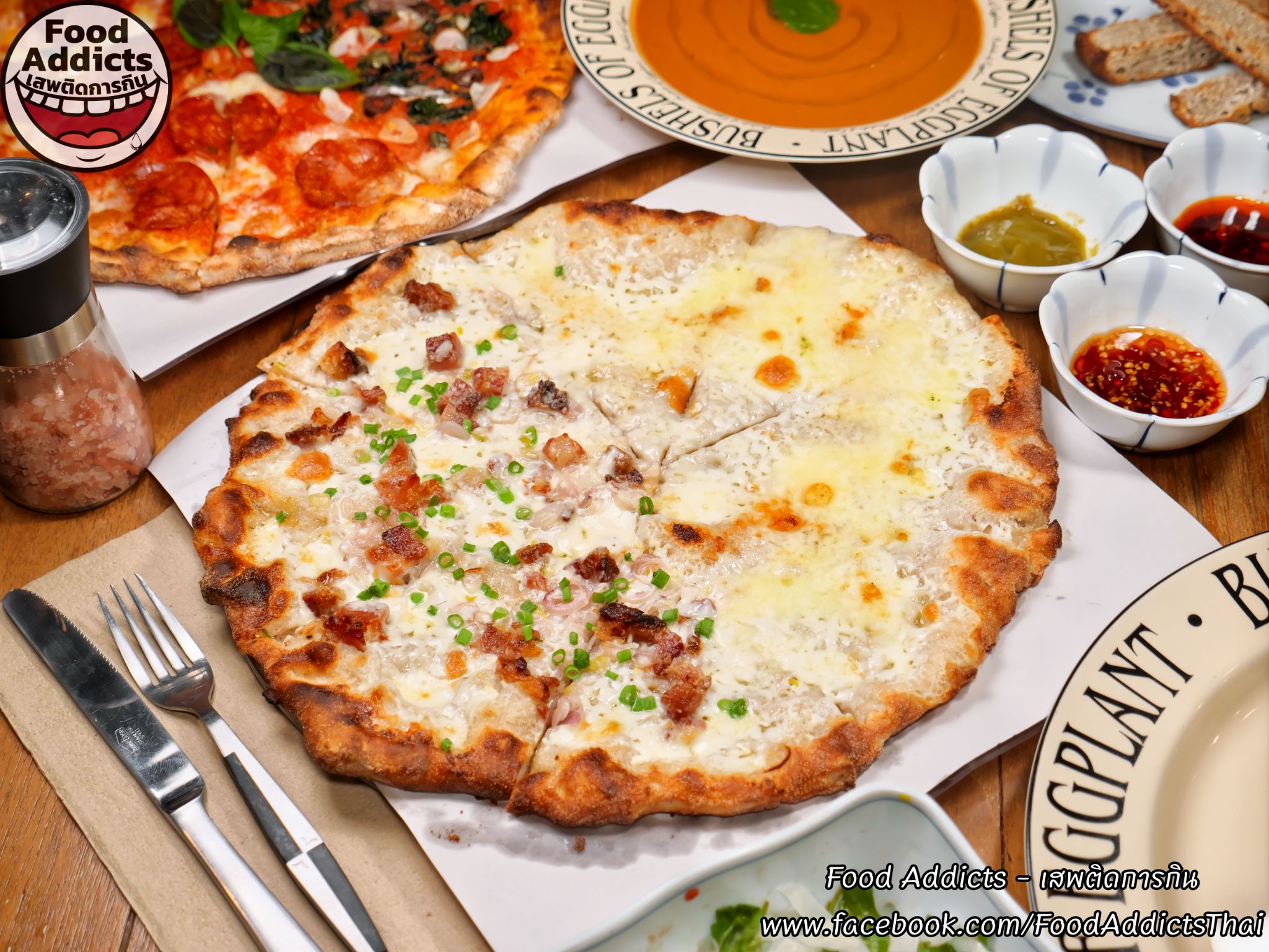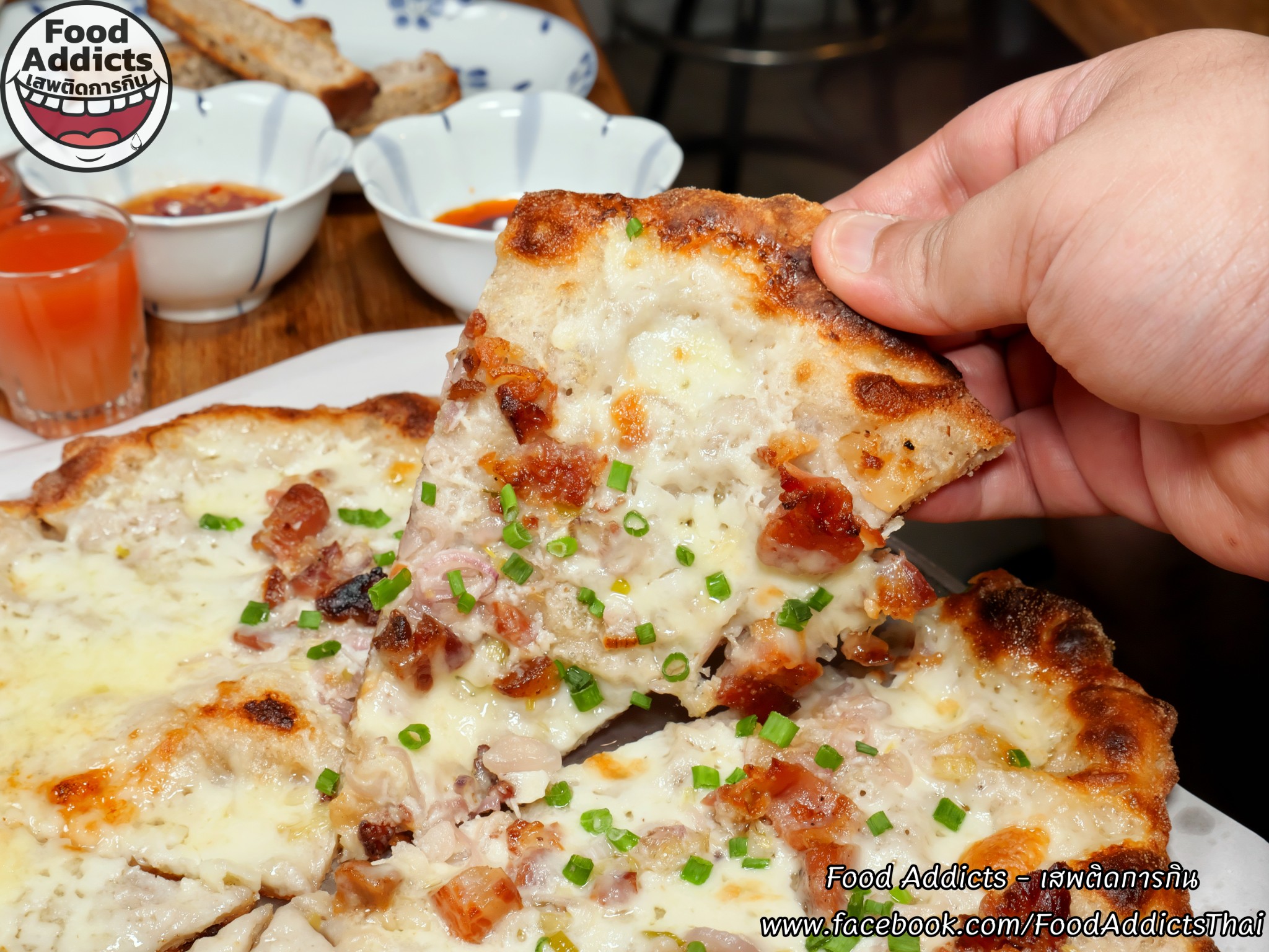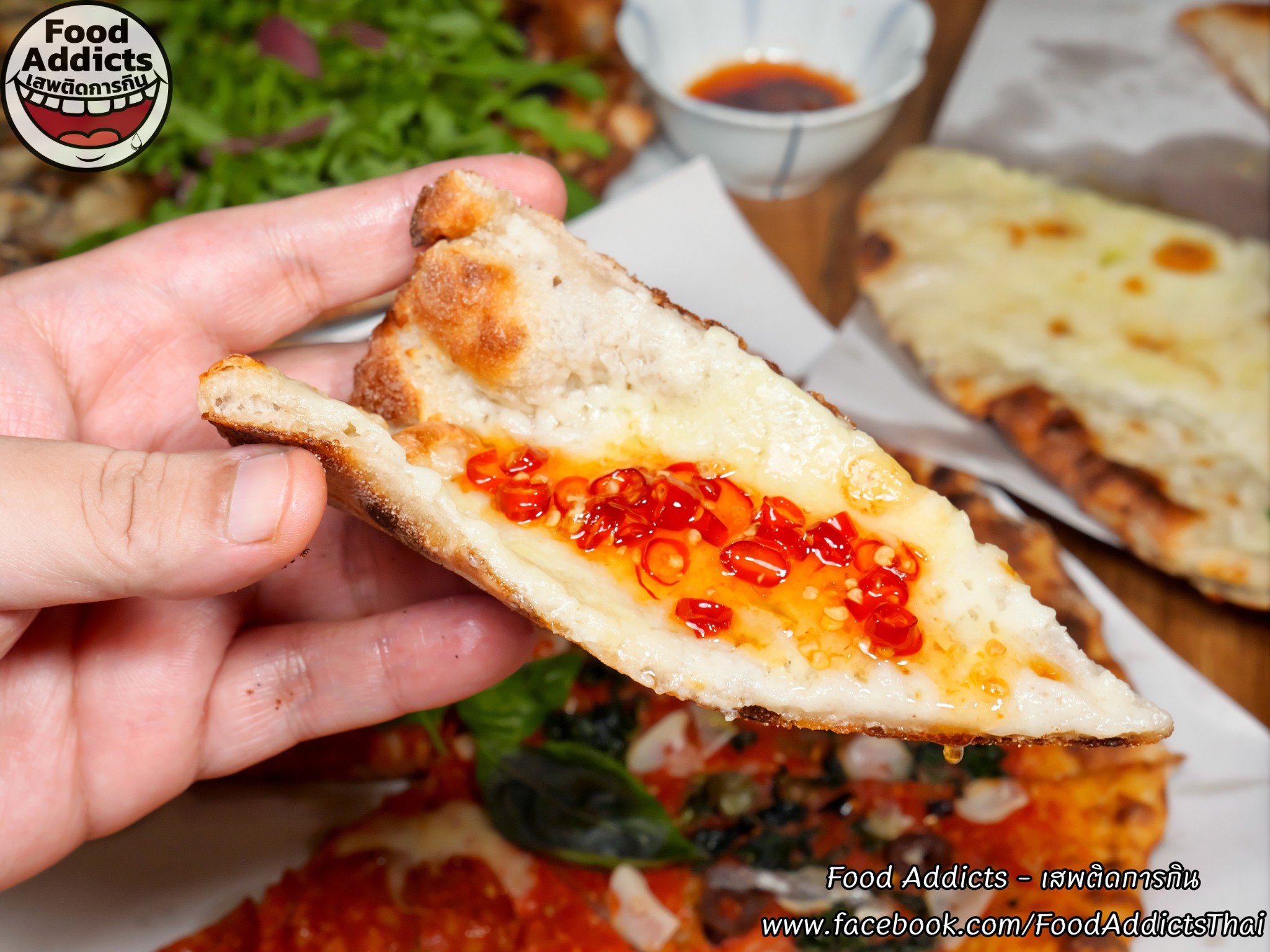 ถาดถัดไปหน้าตาดูธรรมดาแต่ยังคงความซับซ้อนใส่ใจหลายขั้นตอนมากกว่าที่เรามองเห็นสลับเปลี่ยนรสชาติให้มื้อเย็นนี้รู้สึกหลากหลายด้วยเมนู "Bacon Sour Cream & Chives" ขนาด Haft ราคา 250 บาท ส่วนประกอบหลักได้แก่ซาวเออร์ครีมเปรี้ยวโฮมเมดสีขาว/มอสซาเรลล่าชีสแท้ 100% สัมผัสเหนียวยืด/เบคอนหมูสามชั้นรมควันแบบหนาพิเศษเค็มน้อย/หอมแดงดองและต้นหอมสดซอยละเอียดรู้สึกสดชื่นรับประทานง่ายหยิบเพลินกว่าที่คิด อีกฝั่งใครไม่กลัวเลี่ยนร่างกายแข็งแกร่งพร้อมปะทะเสมอต้องลองสั่ง "Five Cheese" ราคา 275 บาท พื้นฐานคล้ายรายการก่อนหน้าโดยกระหน่ำใส่ชีสเยอะถึง 5 ชนิดได้แก่ 1. มอสซาเรลล่าธรรมดา 2. กอร์กอนโซลาดอลเช่เชื้อราสีฟ้ากลิ่นฉุนขึ้นจมูกเข้มข้นรุนแรงสัญชาติอิตาเลียน 3. เอ็มเมนทอลชื่อดังจากสวิตเซอร์แลนด์ก้อนสีเหลืองอ่อนแทรกฟองอากาศรูพรุนเป็นเอกลักษณ์หอมแนวเมล็ดถั่วกลมกล่อม 4. ทาเลจจิโอผลิต ณ แคว้นลอมบาร์ดีผิวเปลือกนอกสีชมพูปนน้ำตาลสามารถกินได้ข้างในอ่อนนุ่มประดุจผลไม้ตระกูลเบอร์รี่เปรี้ยวหวานแปลกใหม่เกินคาด 5. กรานปาดาโนแข็งแน่นสัมผัสร่วนซุยดั่งฝาแฝดพาร์เมซานแต่ละมุนอ่อนโยนมากกว่า วิธีฟินหัวหน้าเชฟคุณ Dhyan (ดิแอน) แนะนำว่าลองเทราด "Hot Honey" น้ำผึ้งผสมพริกขี้หนูเผ็ดร้อนหวานฉ่ำอีกนิดหน่อยรับรองอร่อยลงตัวยิ่งขึ้นครับ