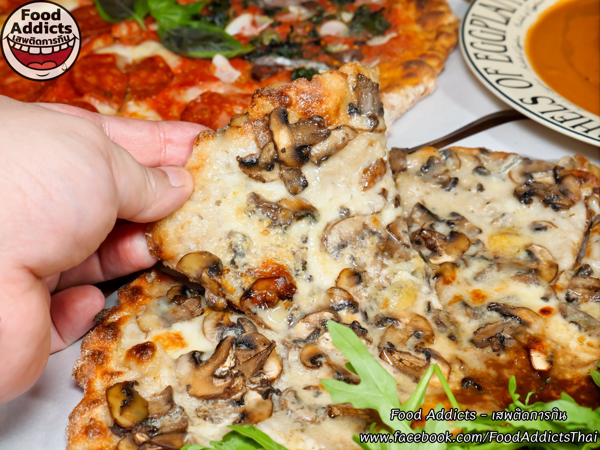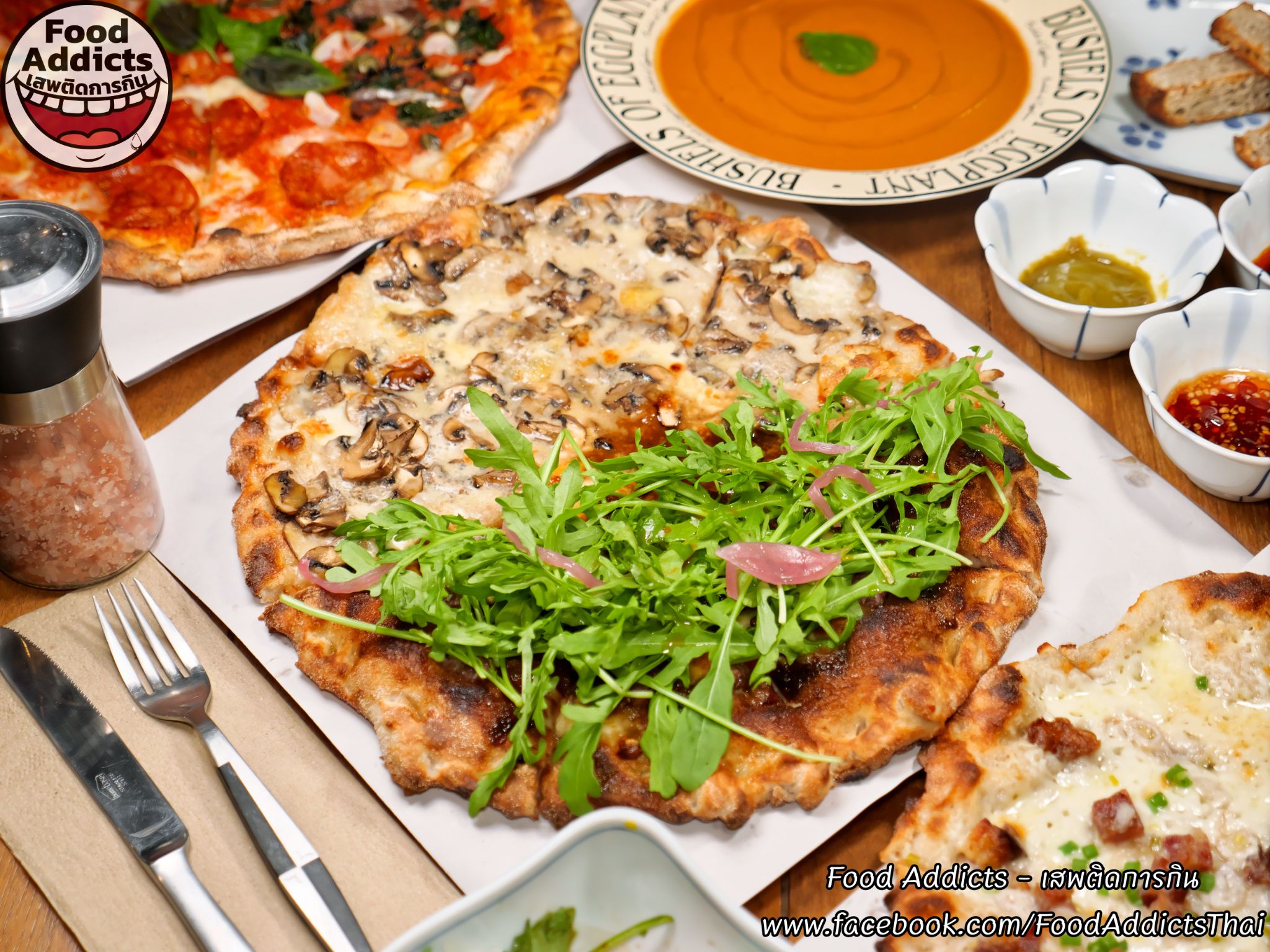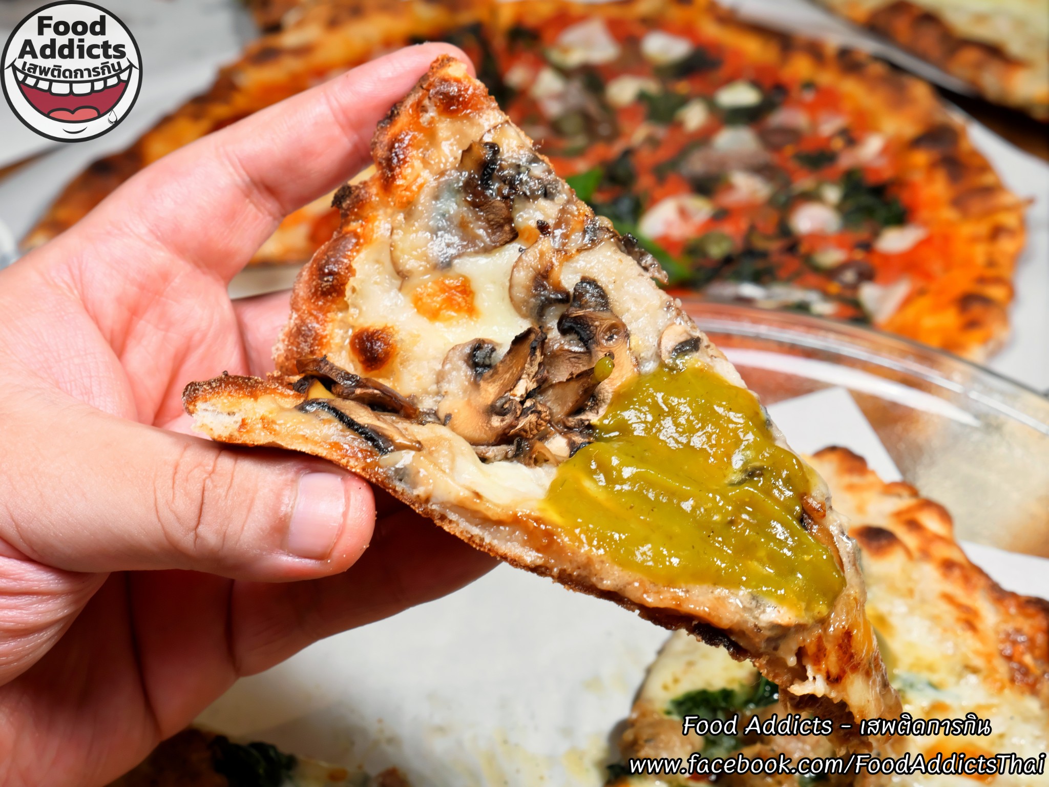 ถาดถัดไปหน้าตาดูธรรมดาแต่ยังคงความซับซ้อนใส่ใจหลายขั้นตอนมากกว่าที่เรามองเห็นสลับเปลี่ยนรสชาติให้มื้อเย็นนี้รู้สึกหลากหลายด้วยเมนู "Bacon Sour Cream & Chives" ขนาด Haft ราคา 250 บาท ส่วนประกอบหลักได้แก่ซาวเออร์ครีมเปรี้ยวโฮมเมดสีขาว/มอสซาเรลล่าชีสแท้ 100% สัมผัสเหนียวยืด/เบคอนหมูสามชั้นรมควันแบบหนาพิเศษเค็มน้อย/หอมแดงดองและต้นหอมสดซอยละเอียดรู้สึกสดชื่นรับประทานง่ายหยิบเพลินกว่าที่คิด อีกฝั่งใครไม่กลัวเลี่ยนร่างกายแข็งแกร่งพร้อมปะทะเสมอต้องลองสั่ง "Five Cheese" ราคา 275 บาท พื้นฐานคล้ายรายการก่อนหน้าโดยกระหน่ำใส่ชีสเยอะถึง 5 ชนิดได้แก่ 1. มอสซาเรลล่าธรรมดา 2. กอร์กอนโซลาดอลเช่เชื้อราสีฟ้ากลิ่นฉุนขึ้นจมูกเข้มข้นรุนแรงสัญชาติอิตาเลียน 3. เอ็มเมนทอลชื่อดังจากสวิตเซอร์แลนด์ก้อนสีเหลืองอ่อนแทรกฟองอากาศรูพรุนเป็นเอกลักษณ์หอมแนวเมล็ดถั่วกลมกล่อม 4. ทาเลจจิโอผลิต ณ แคว้นลอมบาร์ดีผิวเปลือกนอกสีชมพูปนน้ำตาลสามารถกินได้ข้างในอ่อนนุ่มประดุจผลไม้ตระกูลเบอร์รี่เปรี้ยวหวานแปลกใหม่เกินคาด 5. กรานปาดาโนแข็งแน่นสัมผัสร่วนซุยดั่งฝาแฝดพาร์เมซานแต่ละมุนอ่อนโยนมากกว่า วิธีฟินหัวหน้าเชฟคุณ Dhyan (ดิแอน) แนะนำว่าลองเทราด "Hot Honey" น้ำผึ้งผสมพริกขี้หนูเผ็ดร้อนหวานฉ่ำอีกนิดหน่อยรับรองอร่อยลงตัวยิ่งขึ้นครับ