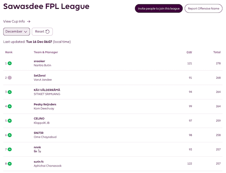 ตารางคะแนนเดือน ธ.ค. ของ Sawasdee FPL League หลังจบ GW16