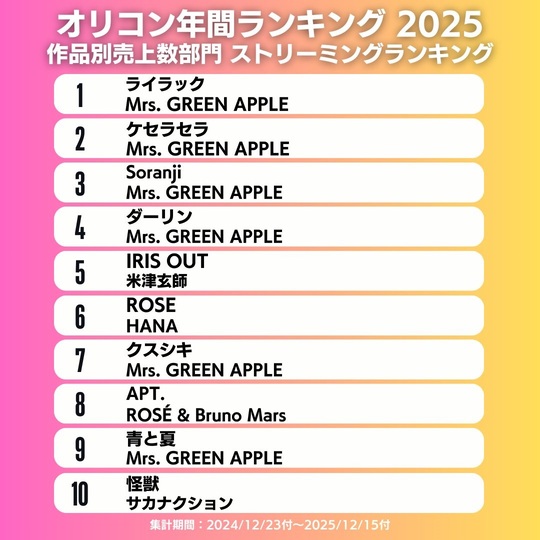 APT. จาก ROSÉ & Bruno Mars เป็นเพลงภาษาต่างประเทศที่มียอดสตรีมสูงสุดบนชาร์ตสตรีมมิ่งประจำปี 2025 ของ Oricon 🇯🇵