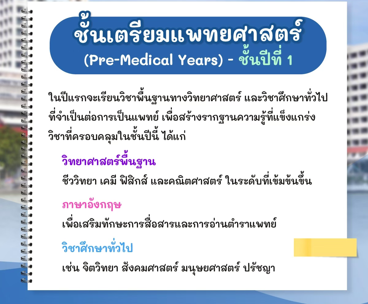 - ปี 1: Pre-Medical Years (เตรียมแพทยศาสตร์) ปูพื้นฐานวิทยาศาสตร์ฉบับเข้มข้น! ทั้ง Bio, Chem, Physics และวิชาศึกษาทั่วไป เพื่อสร้างรากฐานที่แข็งแกร่ง