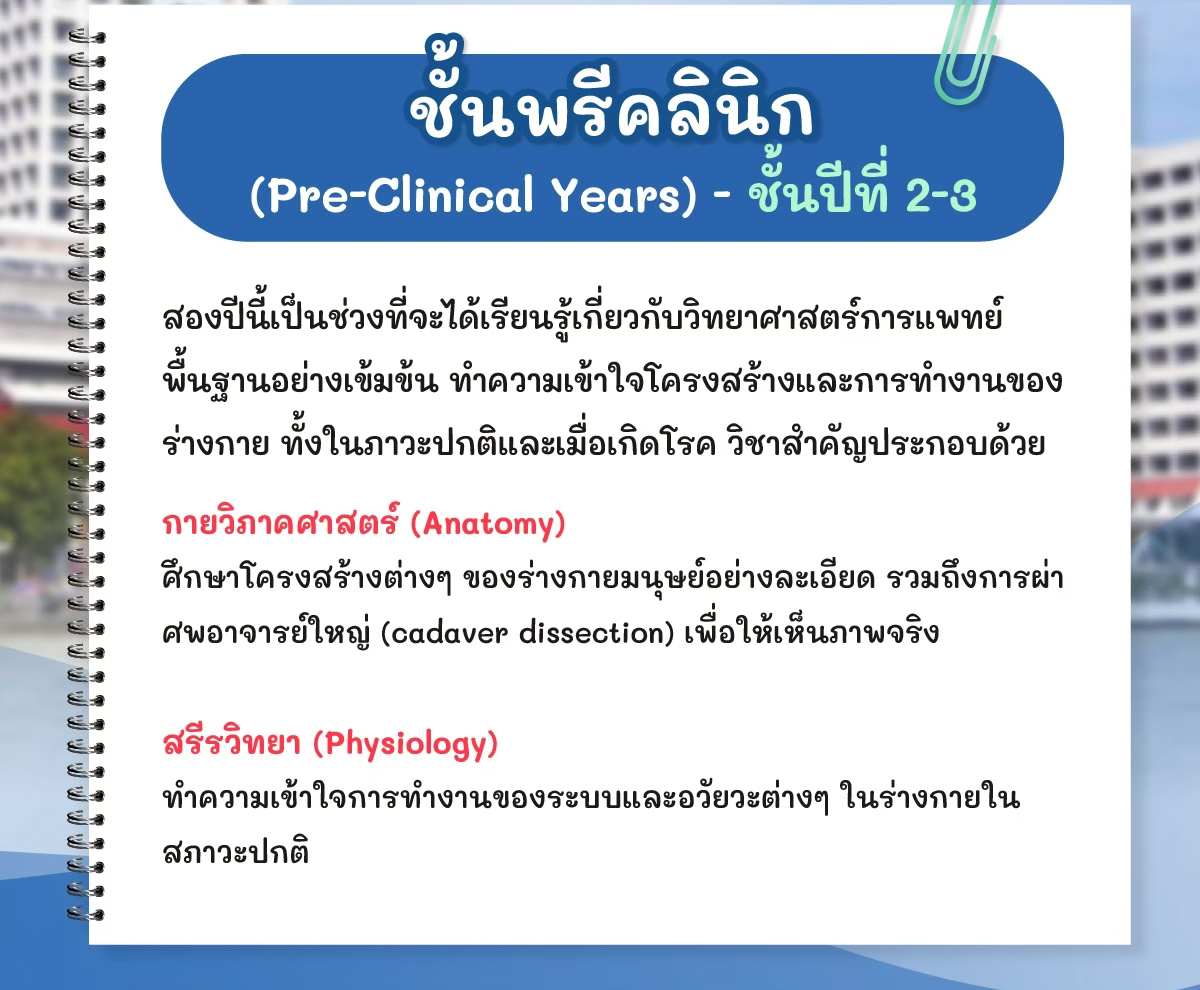 - ปี 2-3: Pre-Clinical Years (ชั้นปรีคลินิก) เข้าสู่โลกของวิทยาศาสตร์การแพทย์เต็มตัว!