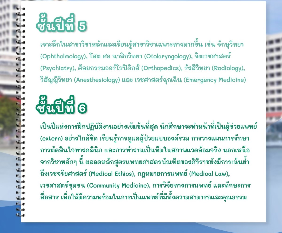 ปี 5: เจาะลึกวิชาเฉพาะทาง เช่น จักษุ (ตา), จิตเวช, รังสีวิทยา และเวชศาสตร์ฉุกเฉิน