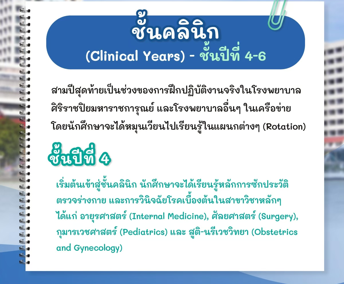 - ปี 4-6: Clinical Years (ชั้นคลินิก) ก้าวเข้าสู่โรงพยาบาลจริง! ฝึกปฏิบัติงาน (Rotation) ในวอร์ดต่างๆ