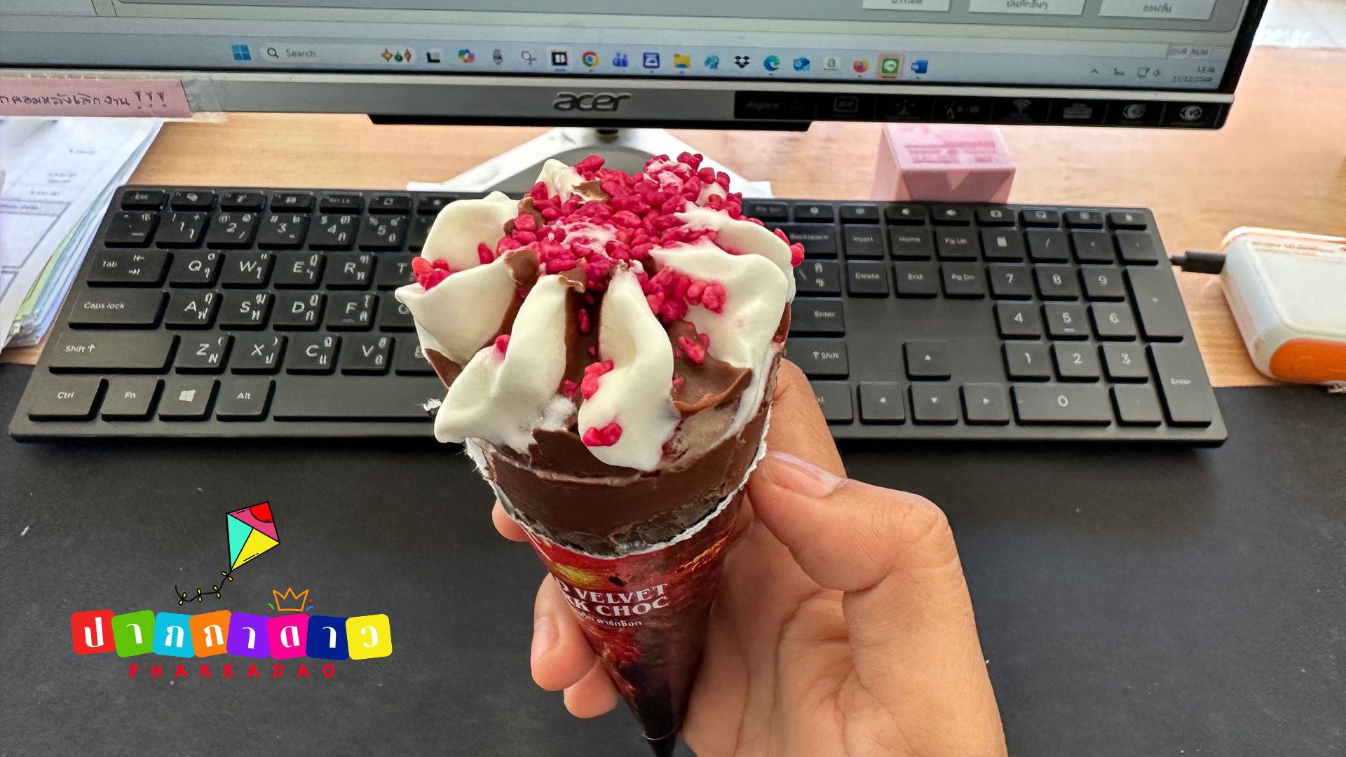 สีสันตรงปกจ้า ตัวไอศกรีมเป็นสีขาวตัดกับซอสช็อกโกแลตเข้มๆ ด้านบนโรยเกล็ดกรุบๆ สีแดง (น่าจะเป็น Red Velvet Crumble)