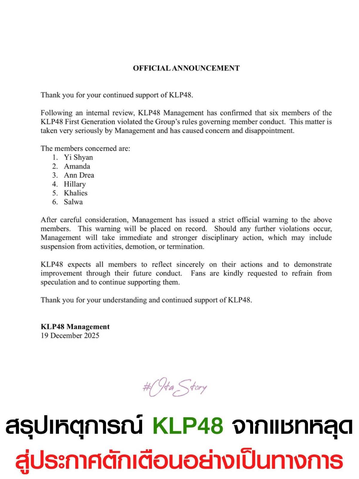 กลายเป็นประเด็นใหญ่โตสำหรับวง KLP48 วงน้องในเครือ 48 Group น้องใหม่ล่าสุดจากประเทศมาเลเซีย เมื่อมีประเด็นแชตหลุดที่สั่นสะเทือนไปทั่วจนทำให้ต้นสังกัดต้องออกประกาศตักเตือนสมาชิกของวงเป็นลายลักษณ์อักษร