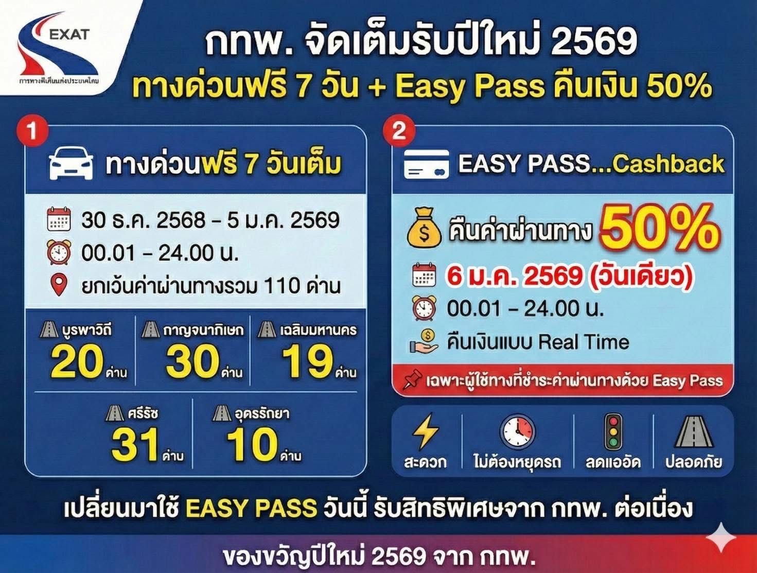 🎉🎉กทพ. จัดเต็มรับปีใหม่ ทางด่วนฟรียาว 7 วัน 🆓ต่อด้วย Easy Pass Cashback 50% ในวันที่ 6 ม.ค. 🥳🎊🎊