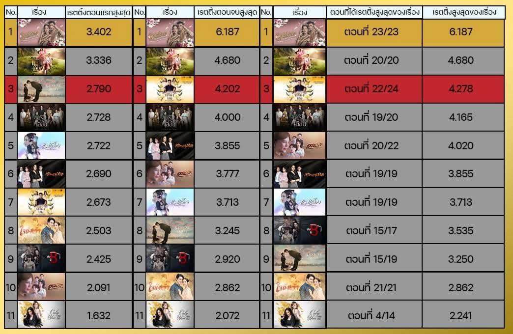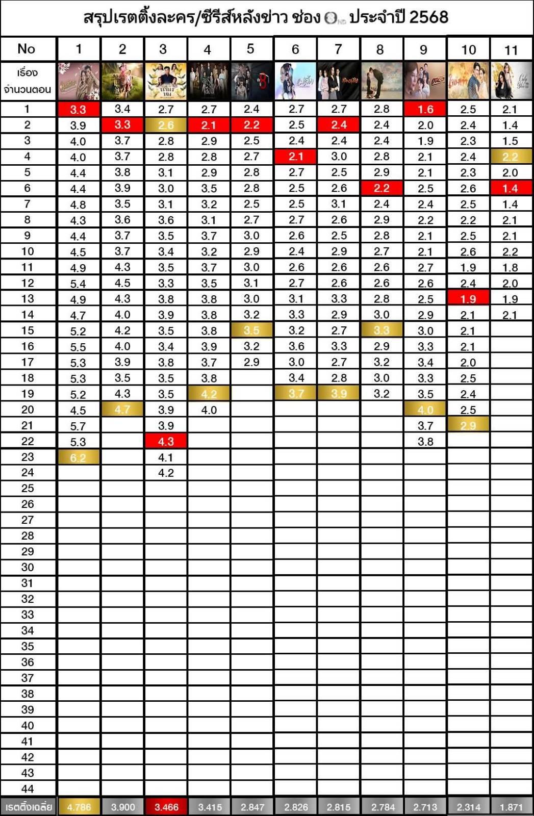 สรุปเรตติ้งละครหลังข่าวและซีรีส์(ช่วง 20:30 น.) ช่อง 3 ประจำปี 2568 ข้อมูลจาก Rating TV THAI