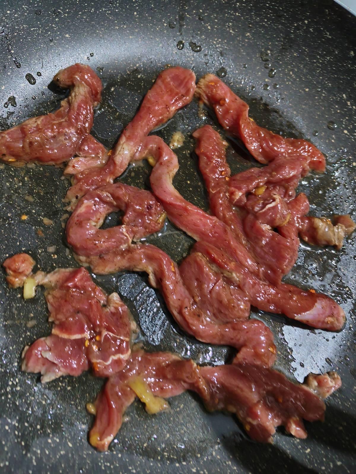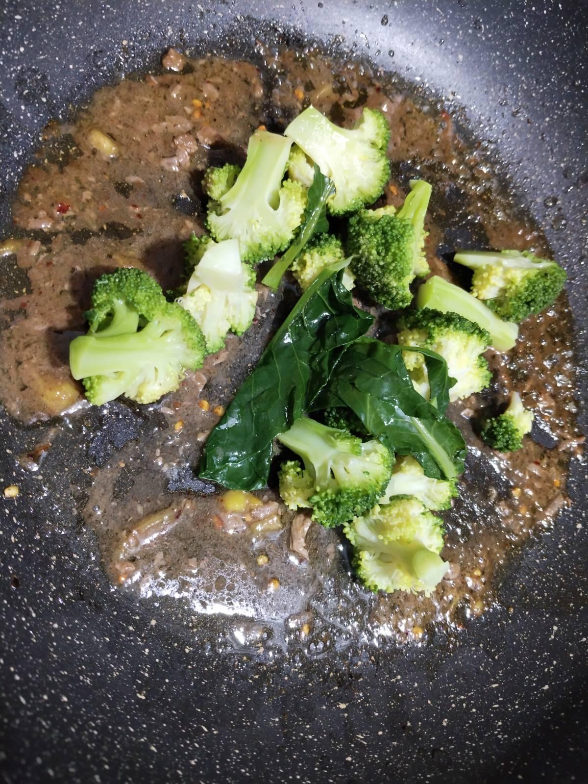 เอาเนื้อออก ผัดผักกับน้ำหมักในกระทะ
