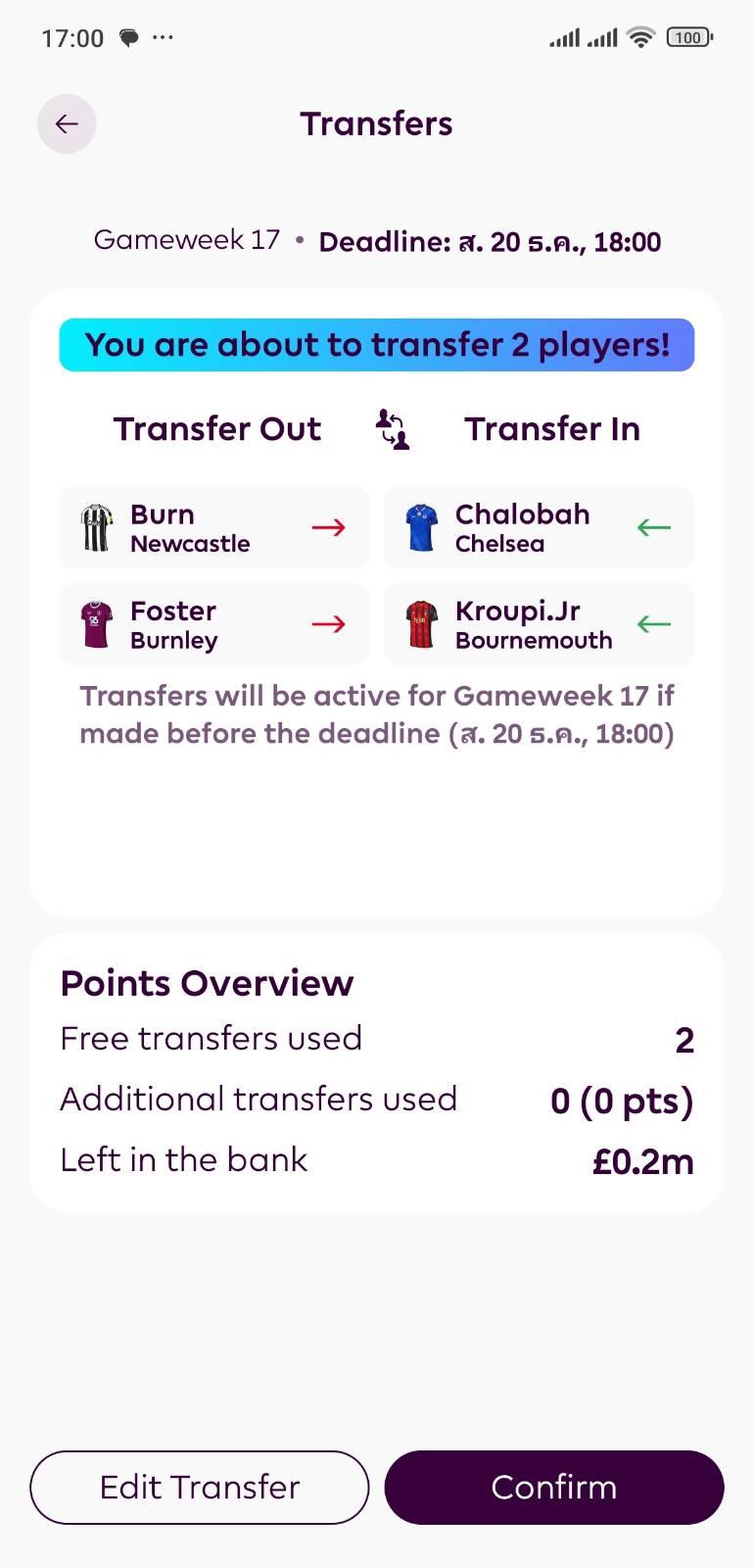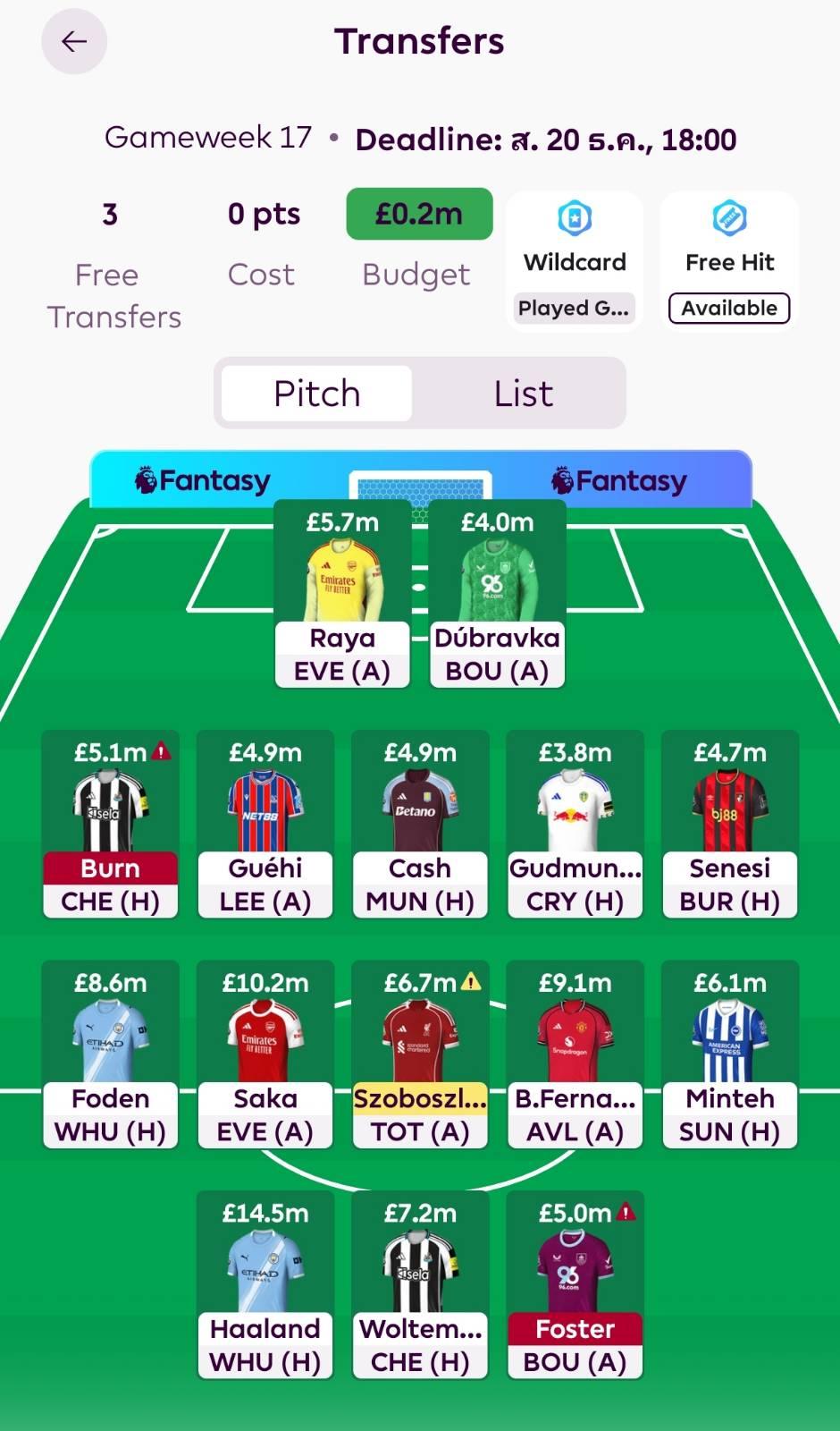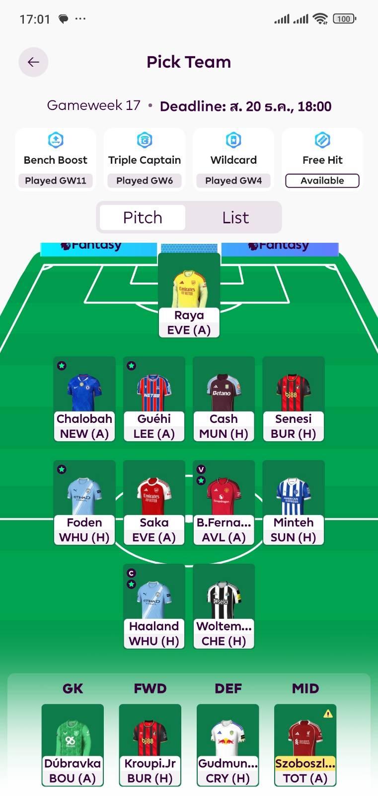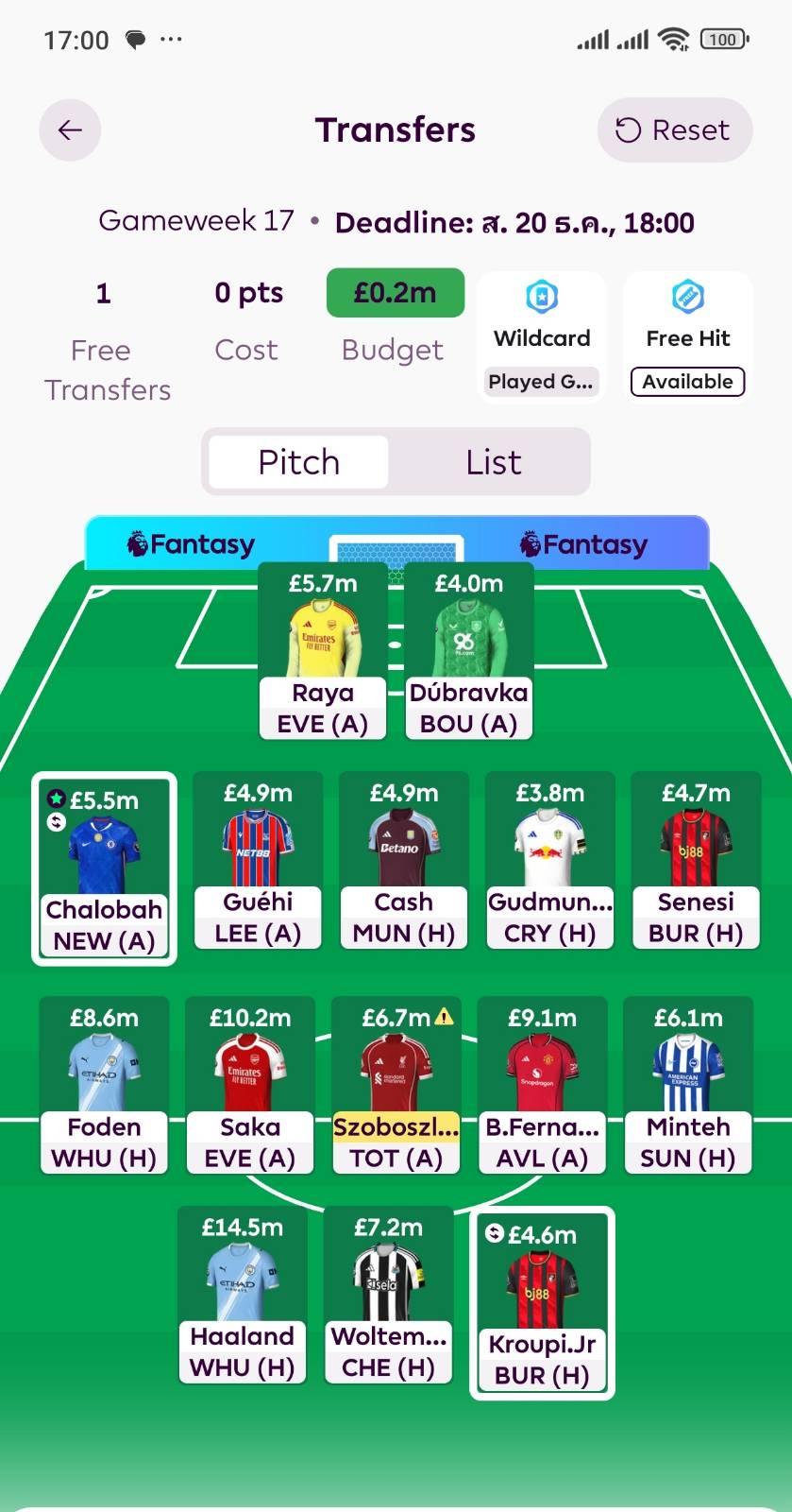 FPL (Fantasy Premier League) GW17 เดดไลน์วันนี้ 18.00 น.