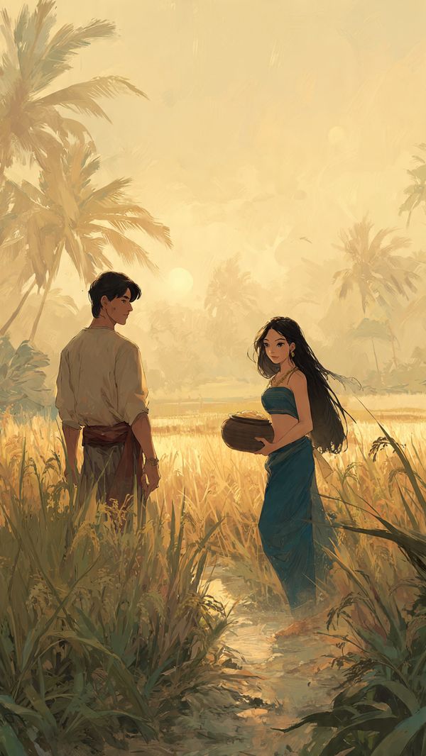 กุมาริกาคนหนึ่งเดินมาจากทิศตรงข้าม ถือหม้อข้าวต้มที่ยังคงอบอวลไอร้อน นุ่งผ้าซิ่นสีครามอ่อน ผมยาวประบ่าสะบัดไหวเบา สีหน้าสงบนิ่ง แต่ดวงตามีประกายแห่งปัญญา