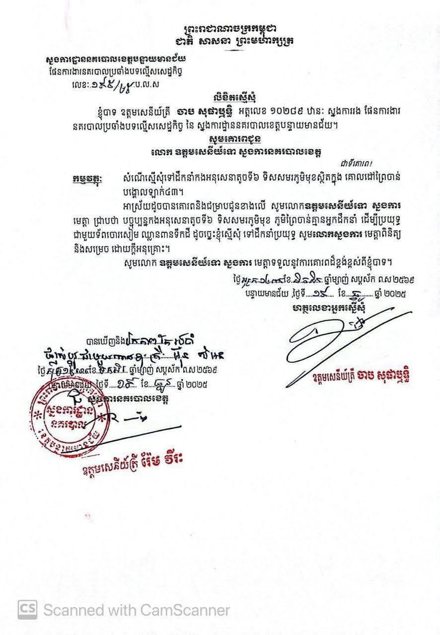 จังหวัดบันเตียเมียนเจย: ท่านพลตำรวจตรี จาบ สุภาฤทธิ์ (Chab Sopharith) หมายเลขประจำตัว 10289 รองผู้บังคับการตำรวจภูธรจังหวัด รับผิดชอบแผนกตำรวจต่อต้านอาชญากรรมทางเศรษฐกิจ แห่งกองบังคับการตำรวจภูธรจังหวัดบันเตียเมียนเจย ได้ยื่นหนังสือเสนอต่อท่านพลตำรวจโท ผู้บังคับการตำรวจภูธรจังหวัดบันเตียเมียนเจย
