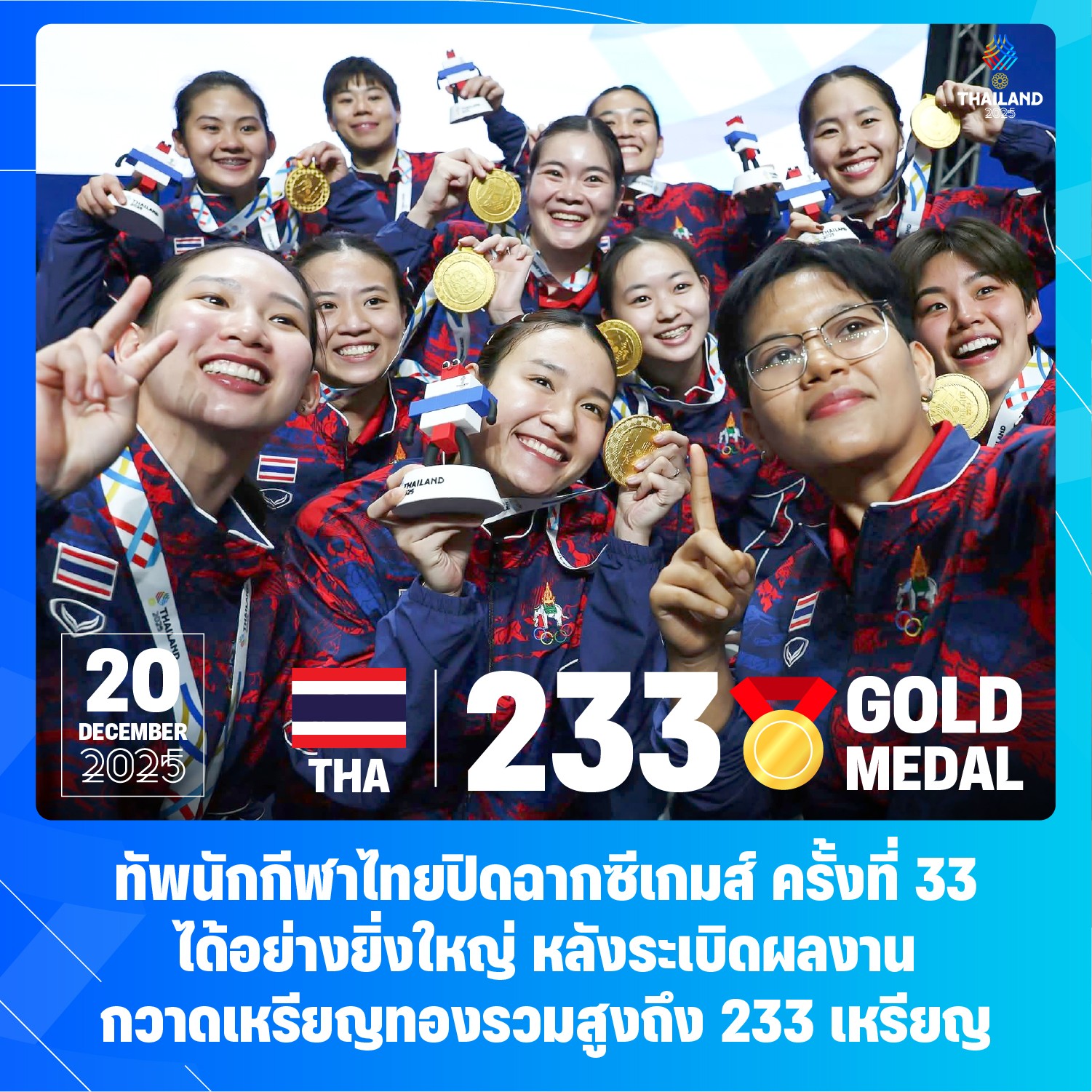 มหกรรมกีฬาซีเกมส์ 2025 ซึ่งประเทศไทยรับหน้าที่เป็นเจ้าภาพ ระหว่างวันที่ 9–20 ธันวาคม 2568 กลายเป็นอีกหนึ่งบทพิสูจน์ศักยภาพวงการกีฬาไทย เมื่อทัพนักกีฬาเจ้าถิ่นเดินหน้าคว้า 233 เหรียญทอง, 154 เหรียญเงิน และ 112 เหรียญทองแดง จากการแข่งขันกีฬาหลัก 50 ชนิดกีฬา ชิงชัยรวมทั้งสิ้น 573 เหรียญทอง (จากเดิมที่มีกำหนดชิงชัย 574 เหรียญทอง แต่มีการยกเลิกไป 1 เหรียญทอง)