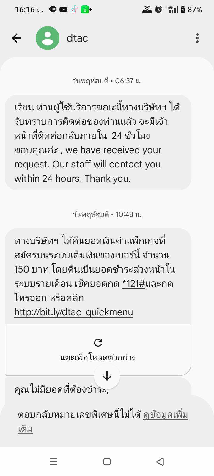 10:48 sms แจ้งคืนเงินค่าแพ็คเกจ 150 บาท