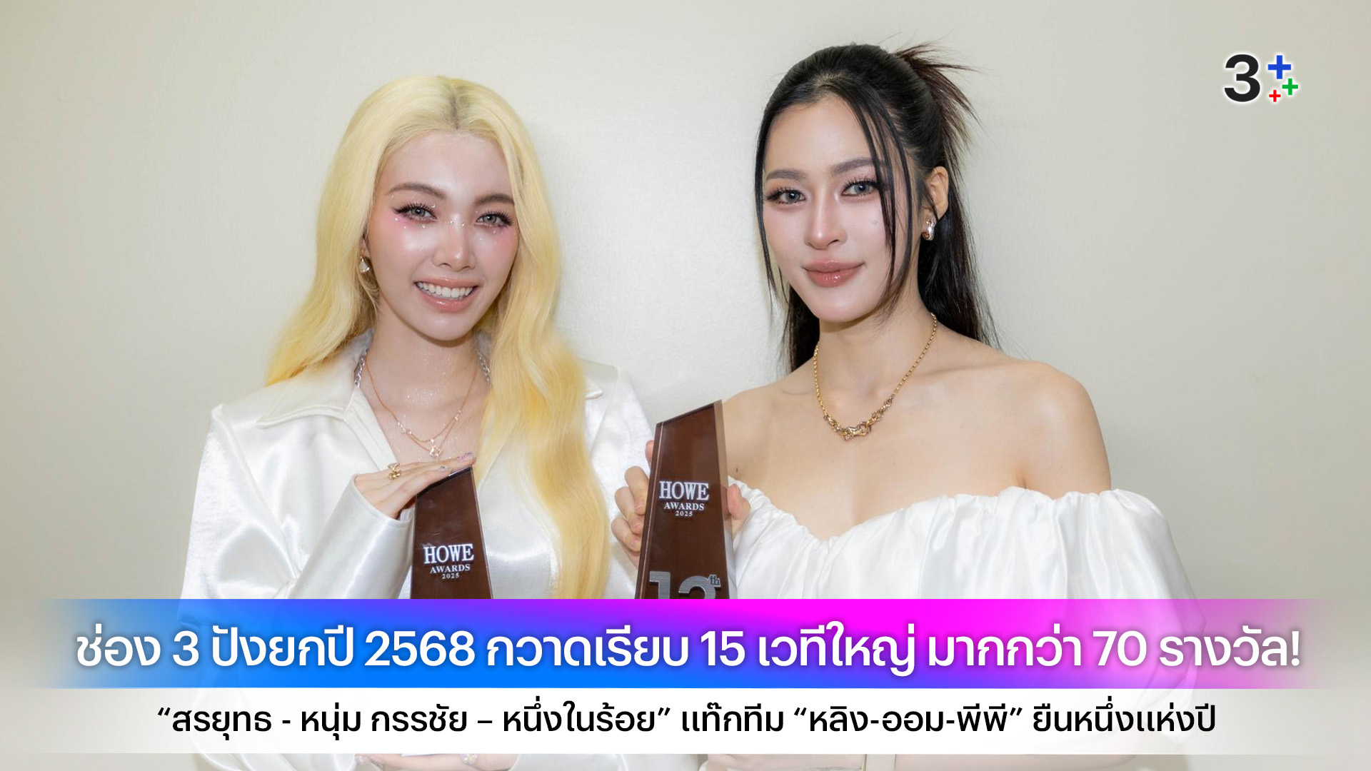 นับว่าปี 2568 เป็นอีกหนึ่งปีทองของช่อง 3 ทั้งละครที่สร้างกระแสฟีเวอร์ ซีรีส์แซฟฟิกยืนหนึ่งแห่งปี รวมถึงรายการข่าวที่ครองใจผู้ชมทั่วประเทศ การันตีด้วยรางวัลจากหลากหลายเวที โดยในปีนี้ ช่อง 3 พร้อมด้วย นักแสดง-ผู้ประกาศข่าว ผู้จัดละคร เดินสายกวาดรางวัลเรียบจาก 15 เวทีใหญ่ คว้าไปมากกว่า 70 รางวัล ซึ่งผลงานโดดเด่นที่สุดต้องยกให้ผู้ประกาศข่าวคนเก่ง “สรยุทธ สุทัศนะจินดา” พิธีกรคนดัง “หนุ่ม กรรชัย” และ รายการโหนกระแส ขึ้นแท่นรายการยอดนิยม ละครสุดปังมอบมงให้ “หนึ่งในร้อย” พีเรียดสุดอลังการ แท๊กทีมละครสะท้อนสังคม “ในวันที่ฝนพร่างพราย” ที่ขาดไม่ได้เลยคือ 3 สาวสุดฮอต “หลิงหลิง คอง - ออม กรณ์นภัส - พีพี ปุญญ์ปรีดี” ควงแขนกันขึ้นรับรางวัลหลากหลายเวที