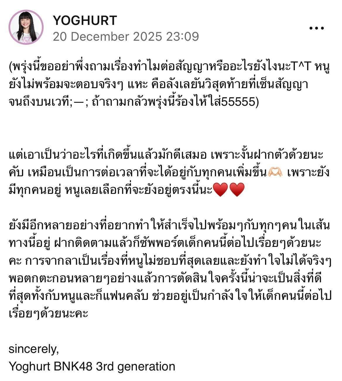 ยังอยากทำอะไรหลายอย่างให้สำเร็จไปด้วยกันกับแฟนคลับอยู่ และยอมรับว่าการจากลาเป็นสิ่งที่ไม่ชอบที่สุดและยังทำใจไม่ได้