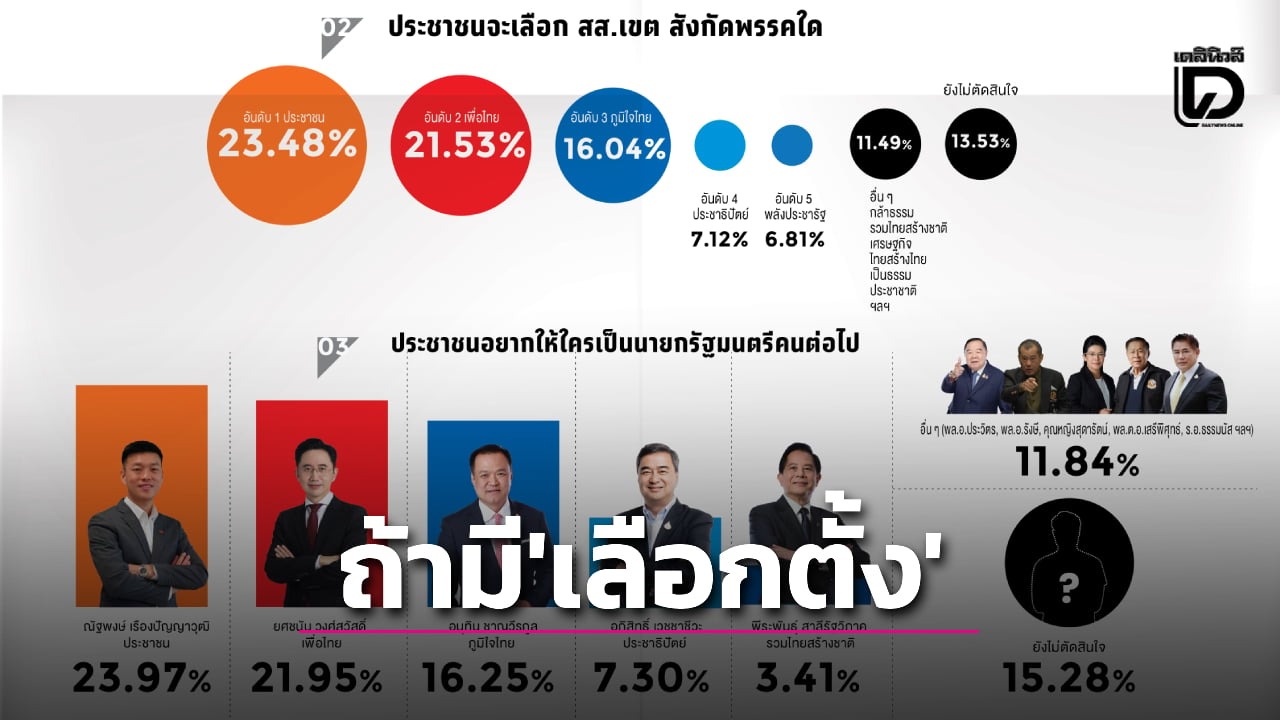 สวนดุสิตโพล เผย ถ้ามีเลือกตั้ง 8 ก.พ. 69 ผลสำรวจชี้ "พรรคประชาชน" ยังครองแชมป์ความนิยม ทั้ง พรรคและตัวบุคคล ขณะ "เพื่อไทย" ส่งสัญญาณบวกหลังรีแบรนด์ ดึง "ยศชนัน" ขึ้นแท่นแคนดิเดตนายกฯ ไล่บี้ "ณัฐพงษ์" ระยะประชิด