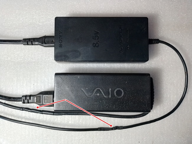 วันนี้ผมซ่อม Adapter ที่ใช้งานไม่ได้แต่ตัวมันไม่เสีย ตัวบนเป็น Adapter ของ Sony PlayStation2 แรงดัน 8.5V กระแส 5.65A ตัวนี้ใช้งานไม่ได้เนื่องจากสายไฟฝ่งขาออกช็อตกันเพราะฉนวนเปื่อย ผมตัดแล้วต่อใหม่ช้ท่อหดหุ้มไว้ก็ใช้ได้แล้ว ตัวล่างเป็น Adapter ของ Sony Vaio แรงดัน 19.5V กระแส 4.7A ตัวนี้ใช้งานไม่ได้เนื่องจากสายขาด การซ่อมก็ใช้วิธีแบบเดียวกันคือตัดต่อบัดกรีแล้วหุ้มด้วยท่อหดก็ใช้งานได้