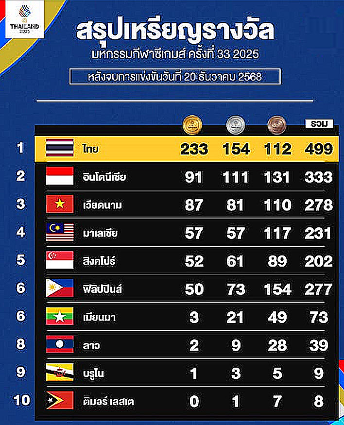 ประเทศไทยได้เหรียญทองรวมอันดับ 1บ่อยที่สุดใน Sea Games