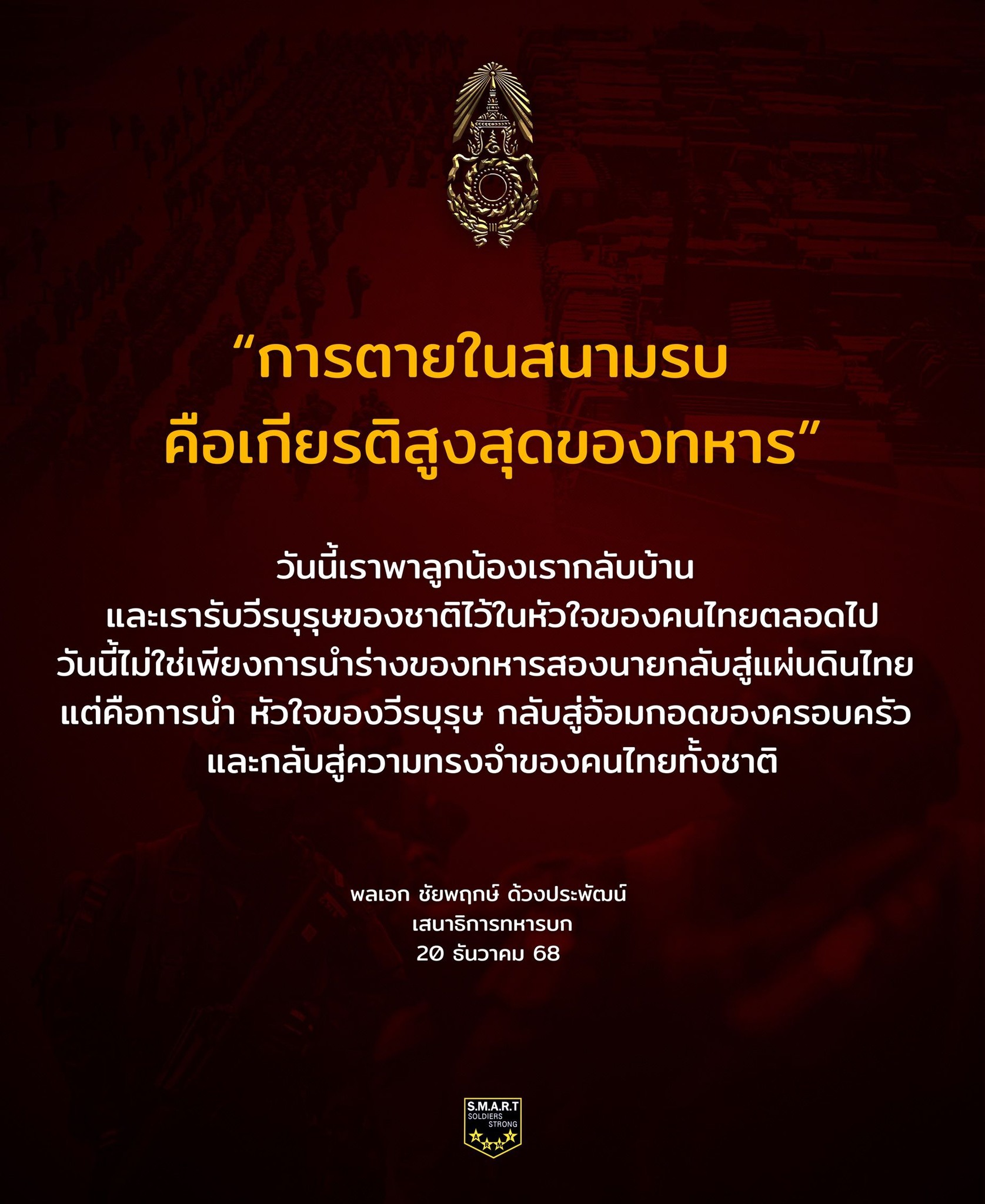 วันนี้ไม่ใช่เพียงการนำร่างของทหารสองนายกลับสู่แผ่นดินไทย แต่คือการนำ หัวใจของวีรบุรุษ กลับสู่อ้อมกอดของครอบครัว และกลับสู่ความทรงจำของคนไทยทั้งชาติ