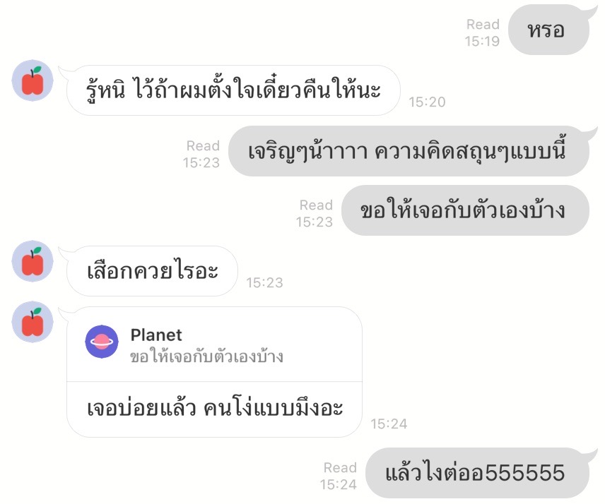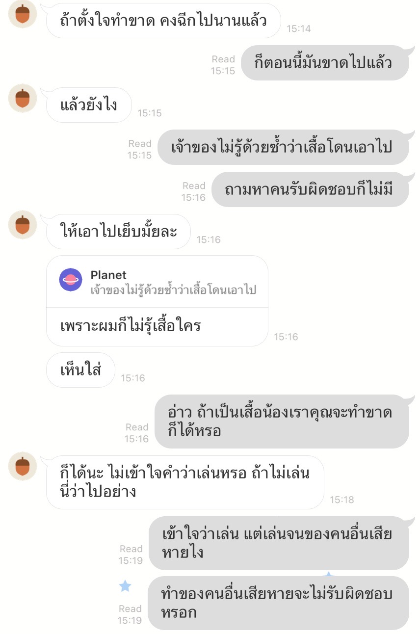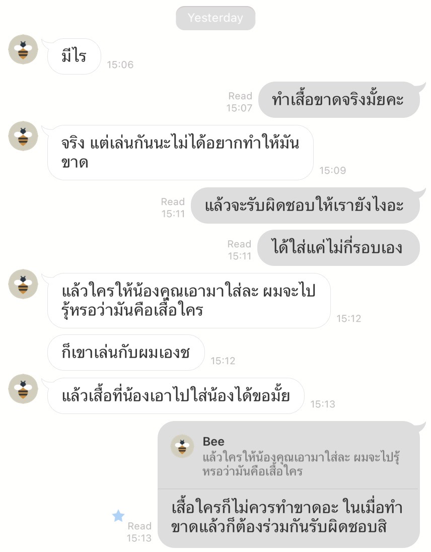 และไม่กี่สัปดาห์ที่ผ่านมาเขาเอาเสื้อหนูไปใส่โดยไม่ขอ(ไปพัทยากับเพื่อน) พอหนูจับได้ก็ทวงคืนตอนแรกเขาโกหกว่าลืมไปบ้านเพื่อน พอหนูทวงอีกบอกว่าแฟนเพื่อนเอาไปใส่ พออีกรอบบอกเสื้อขาดไปแล้ว แต่หนูมารู้ความจริงทีหลังว่าเขาโกหก เสื้อมันขาดตั้งแต่อยู่พัทยาแล้ว เขาบอกว่าเล่นกันจนเสื้อขาด(แฟนเพื่อนเค้าทำแฟนเพื่อนเขาทำขาด) หนูก็เลยทักไปบอกว่าให้แฟนเพื่อนคนนั้นช่วยชดใช้ แต่สิ่งที่แฟนเพื่อนเขาตอบกลับมาคือ ให้หนูทักไปคุยเองถ้าไม่ทักไปคุยก็ไม่ต้องเอาคืน น้องหนูตอบเขาไปว่าทำขาดก็ต้องรับผิดชอบ ฝ่ายนู้นเขาก็ว่า “เรื่องของเขาไม่ใช่เรื่องของพี่” หนูเลยบอกว่างั้นให้เค้าทักมาคุยว่าจะเอายังไง