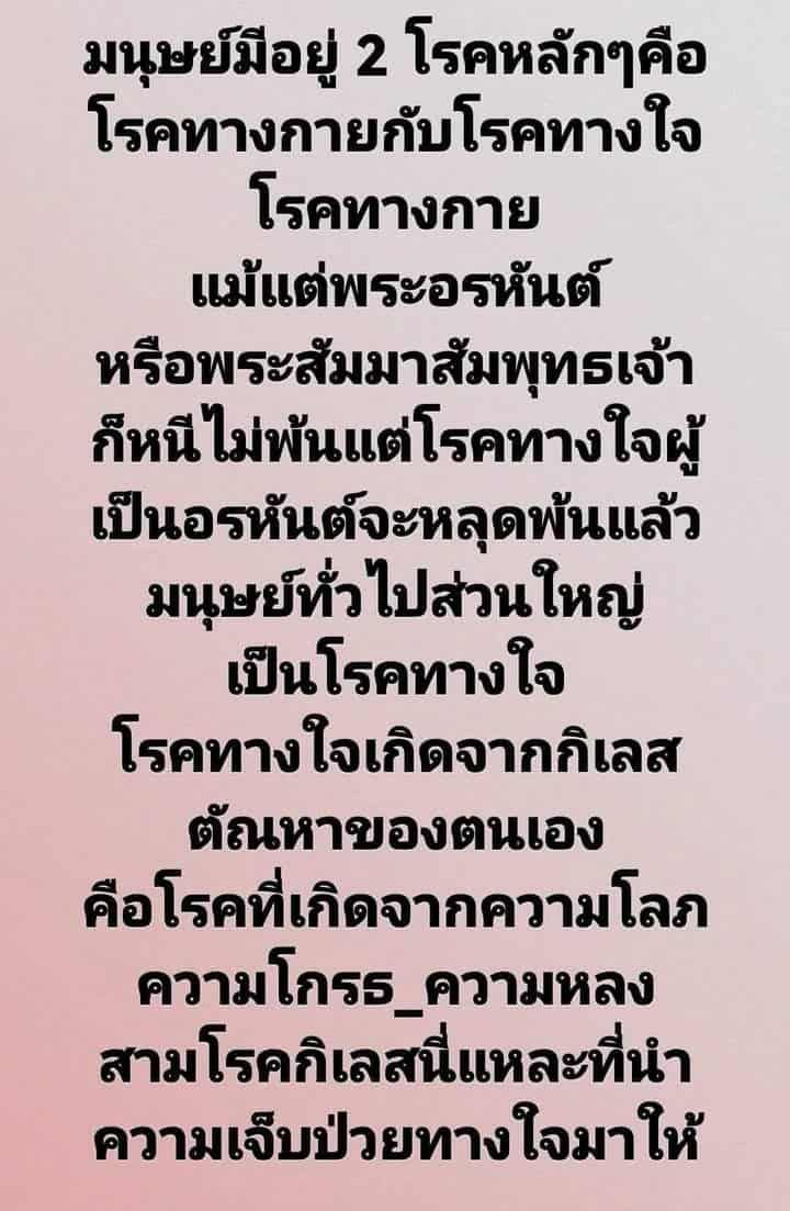 มนุษย์มีอยู่ 2 โรคหลักๆ โรคทางกายกับโรคทางใจ ส่วนใหญ่เป็นโรคทางใจ คือกิเลสตัณหาโลภโกรธหลง ทําให้เป็นโรคทางใจ
