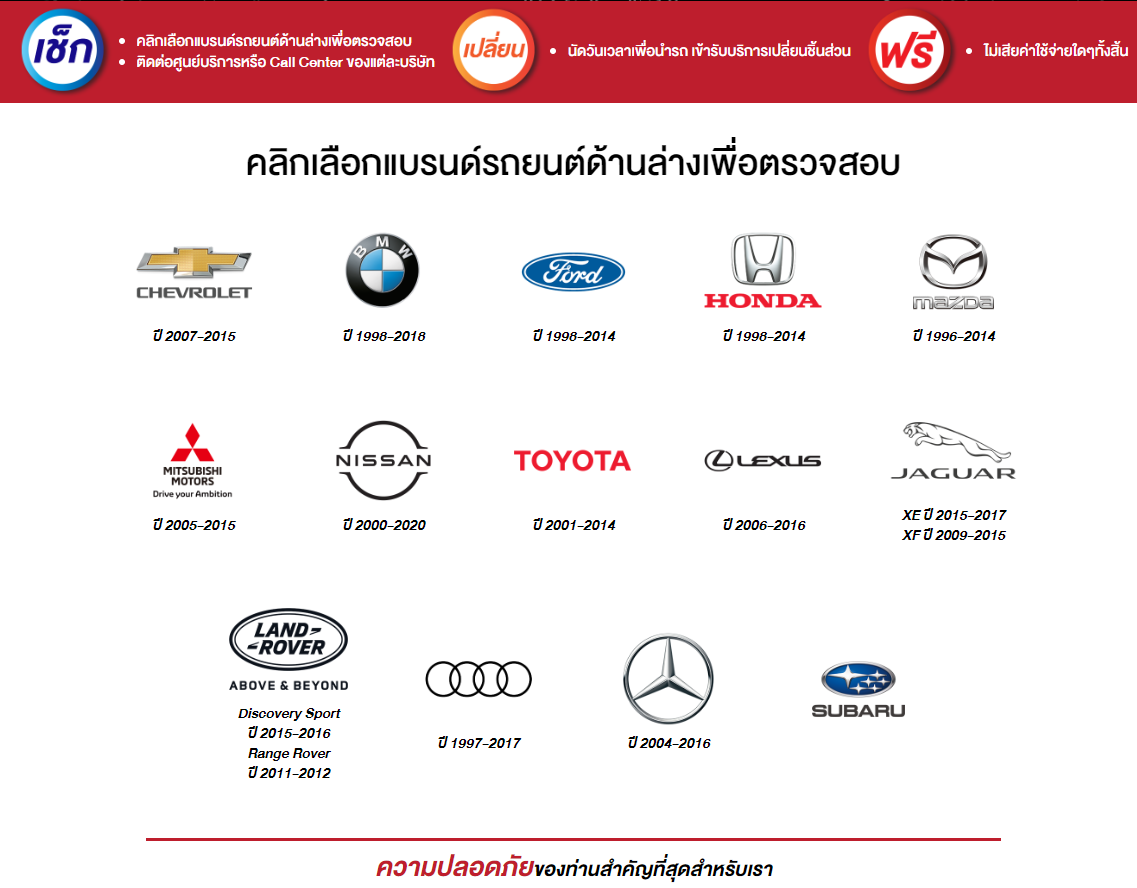 หากพบว่าเป็นรถที่เข้าข่าย ให้รีบติดต่อและนำรถเข้ารับการตรวจสอบและแก้ไขถุงลมนิรภัยที่ศูนย์บริการรถยนต์ใกล้บ้านท่านทั่วประเทศ ฟรีไม่มีค่าใช้จ่ายใดๆ ทั้งสิ้น