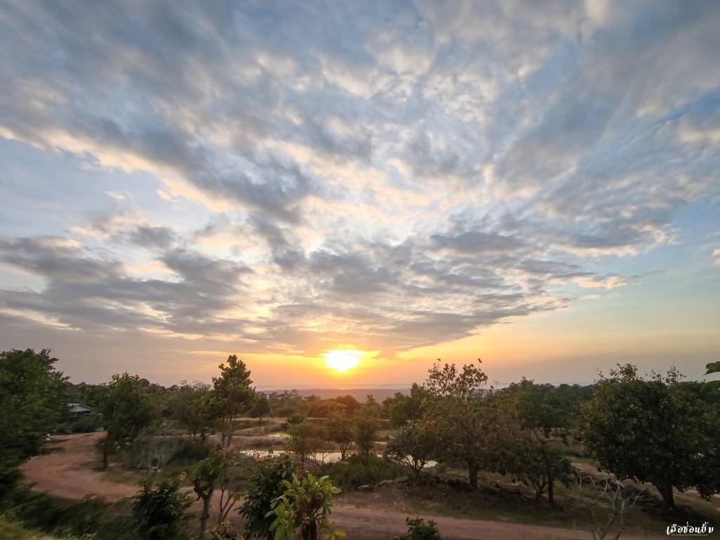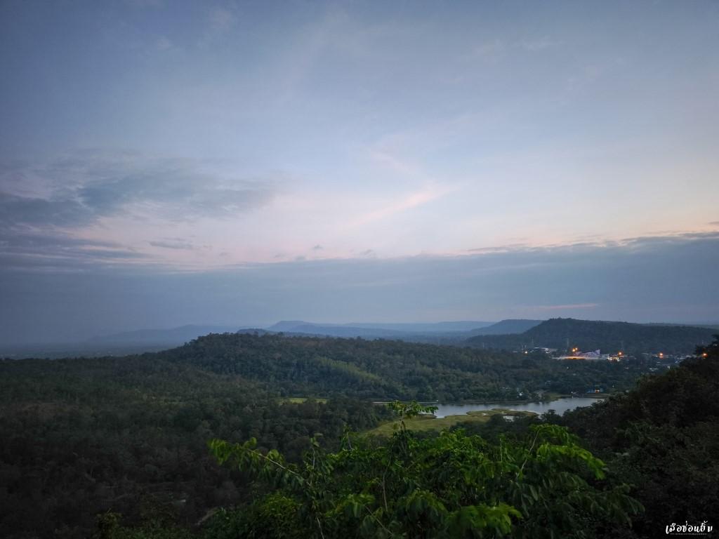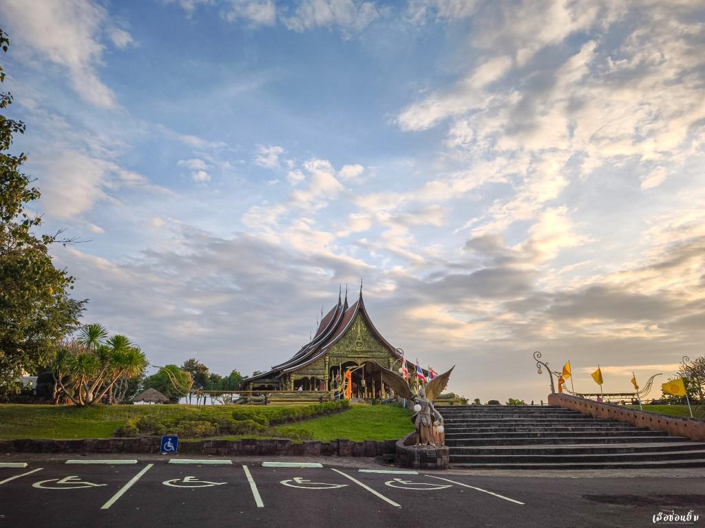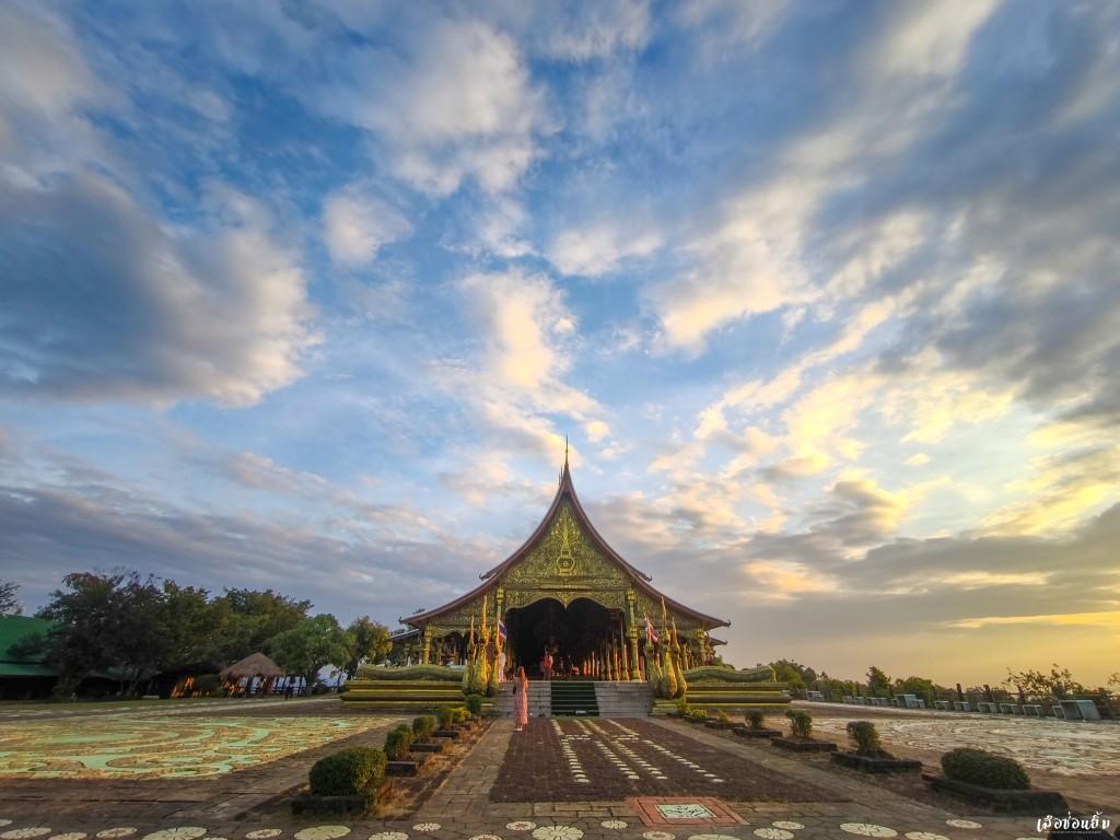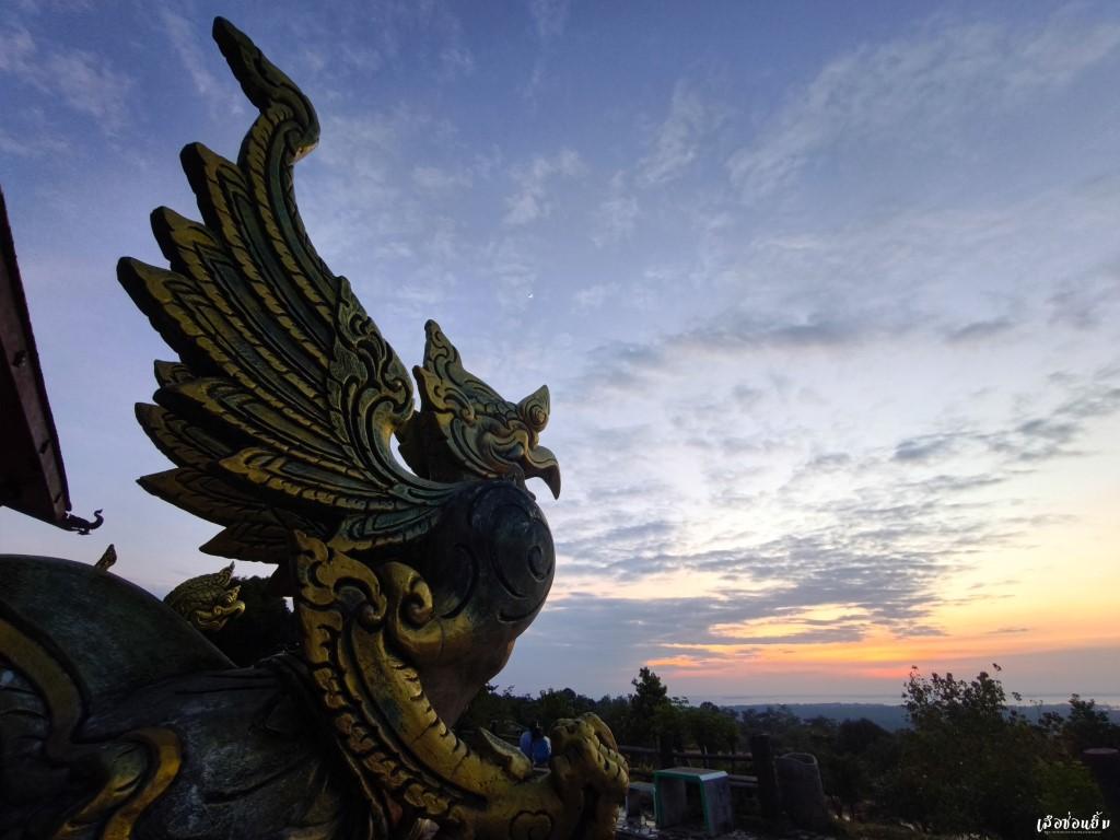 บ้างครั้งการรอคอยอะไรสักอย่างมันช่างยาวนานเสียเหลือเกิน แต่ในห้วงเวลานี้หากมองออกไปทางด้านขวาของอุโบสถ เราจะสามารถมองเห็นทัศนียภาพที่สวยงามเป็นอย่างมาก แสงอาทิตย์สีส้มตัดกับขอบของผืนน้ำบริเวณอ่างเก็บน้ำสิริธร กลายเป็นจุดชมทิวทัศน์ที่สวยงาม ลมเย็นในเดือนพฤศจิกายนผัดผ่านผิวเอากายสั่นไหว พร้อมกับหัวใจที่พองโตเมื่อพบกับภาพความสงบเบื้องหน้า ความเงียบมันดีอย่างงี้เองสินะ และหากเดินต่อไปบริเวณด้านหลังยังสามารถเห็นทิวเขาลำเนาไพรและเห็นบ้านพี่เมืองน้องอย่างประเทศลาวได้จากมุมนี้อีกด้วย