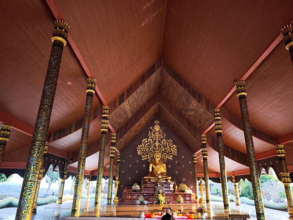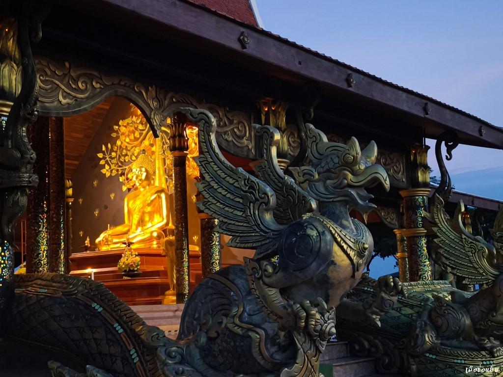 เมื่อมาถึงสถานที่สำคัญของที่แห่งนี้ คือ อุโบสถสีทอง ที่ตั้งเด่นเป็นสง่าที่มาพร้อมกับศิลปะแบบล้านนามาแต่ไกล เกล็ดพญานาค 6 เศียรที่พันรอบอุโบสถสะท้อนจับกับแสงของพระอาทิตย์สีส้มเหลือบเขียวช่างสวยงามวิจิตรงามตาเป็นอย่างมาก รอบนอกยังมีงานปั้นลายดอกบัวและสัตว์ป่าหิมพานต์ด้วยความปราณีตบรรจงเป็น ภายในอุโบสถเป็นที่ประดิษฐานของพระประธานด้านหลังเป็นฉากต้นโพธิ์สีทองเหลืองอร่าม และจุดสำคัญของอุโบสถหลังนี้คือบริเวณผนังหลังอุโบสถด้านนอกที่จะมี ต้นกัลปพฤกษ์ขนาดใหญ่ที่ไม่ใช่ต้นไม้จริง แต่เป็นสุดยอดประติมากรรมการเรียงแผ่นโมเสกที่มีการเคลือบสารเรืองแสงเป็นรูป ต้นกัลปพฤกษ์ ที่จะแผ่กิ่งก้านใบคอยกักเก็บแสงไว้ในช่วงเวลากลางวัน และรอเวลาเจิดจรัสสว่างไสวในยามค่ำคืน