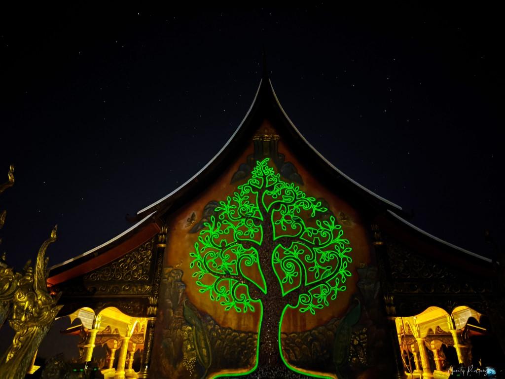 จุดไฮไลท์สำคัญคือบริเวณด้านหลังอุโบสถตรงต้นกัลปพฤกษ์ ที่เริ่มฉายแสงสว่างสีเขียวอร่ามออกมาให้ยลโฉมแบบเทพนิยาย นี่มันมหัศจรรย์มาก ๆ สำหรับใครที่อ่านมาถึงตรงนี้เราจะบอกเทคนิค และแทคติก 2 ข้อด้วยกัน ข้อที่ 1 หากคุณเอาโทรศัพท์มือถือเปิดไฟฉายแล้วไปจ่อที่พื้นบริเวณที่เปล่งประกายด้วยแสงจากสารฟลูออเรสเซนต์ คุณจะสามารถเขียนชื่อคนที่เราคิดถึงแล้วคำนั้นจะปรากฎให้เราเห็น และข้อที่ 2 หากคุณอยากมีภาพสวย ๆ ให้ใช้มือถืออีกเครื่อง (ที่ไม่ใช้เครื่องที่ถ่าย) เปิดไฟฉายและส่องมาที่ตัวแบบ (ประมาณ 45 องศา) ตอนจะถ่ายรูปภาพ และให้ตากล้องเปิดโหมดถ่ายภาพกลางคืนซึ่งส่วนใหญ่โทรศัพท์ใหม่ ๆ จะมี (ปล.ตัวแบบก็พยายามอยู่นิ่ง ๆ ด้วยนะ) แล้วคุณก็จะได้ภาพที่ระลึกออกมาสวยงาม