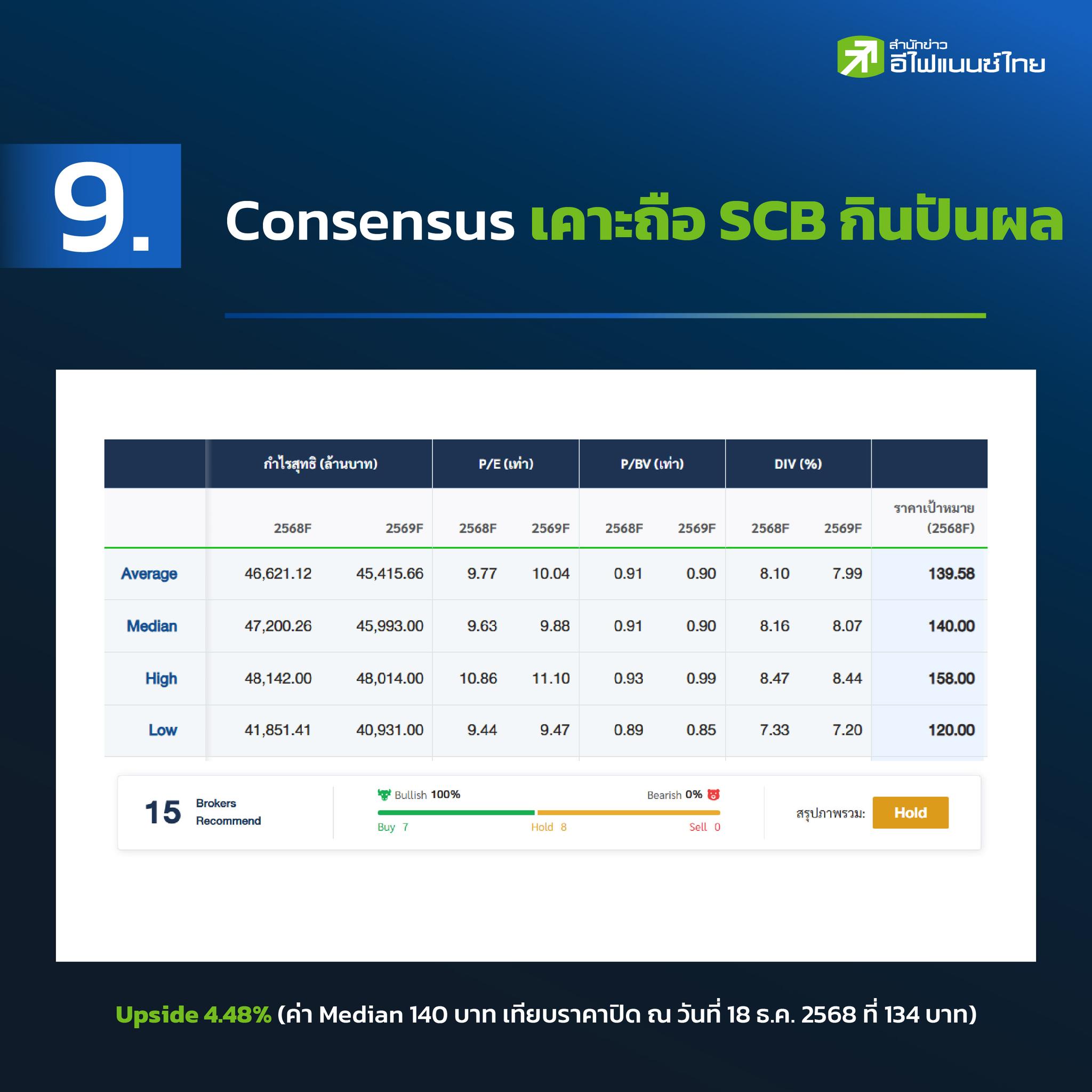 เมื่อรวบรวมประมาณการกำไรจากบทวิเคราะห์ พบว่าตามมุมมองของโบรกเกอร์ส่วนใหญ่ แนวโน้มกำไรของ SCB จะทรงตัวถึงเติบโตแบบค่อยเป็นค่อยไปในระดับที่เกินกว่า 4 หมื่นลบ. ต่อปี สะท้อนภาพแบงก์ขนาดใหญ่ที่กำไรมีเสถียรภาพ ไม่หวือหวาแต่คาดการณ์ได้