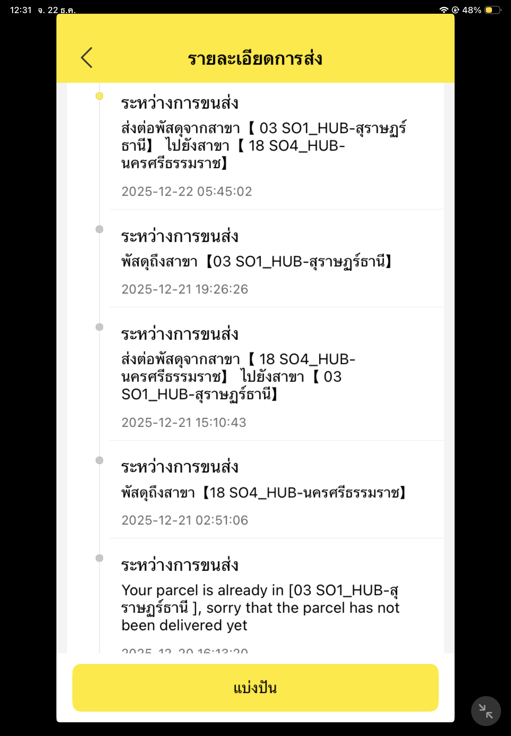 แบบนี้คือยังไงคะ พัสดุมาถึงนครศรีธรรมราชตั้งแต่เมื่อวาน แโดนส่งต่อไปสุราษฏร์ธานีอีก และส่งมานครศรีธรรมราชอีก แบบนี้เมื่อไหรของจะถึงหรอคะ