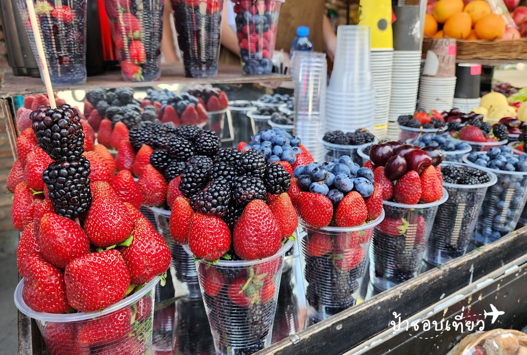 ผลไม้สดใส่แก้วขาย มีอยู่ทั่วไปตามสถานที่ท่องเที่ยว