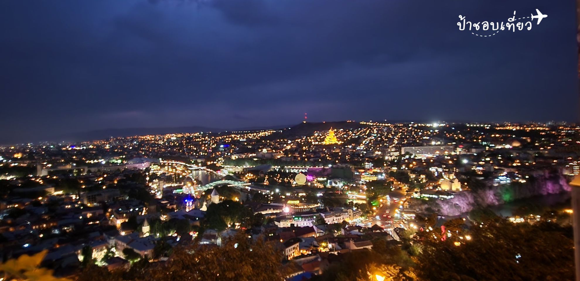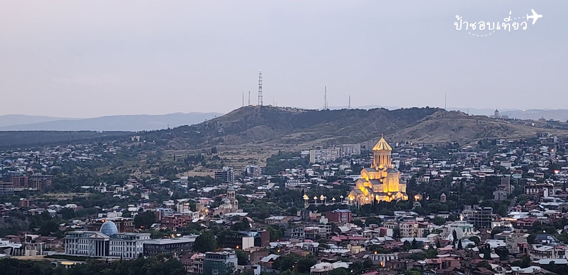 วิว Tbilisi ยามเย็นและค่ำ จะเห็น Holy Trinity Cathedral of Tbilisi อยู่กลางภาพ