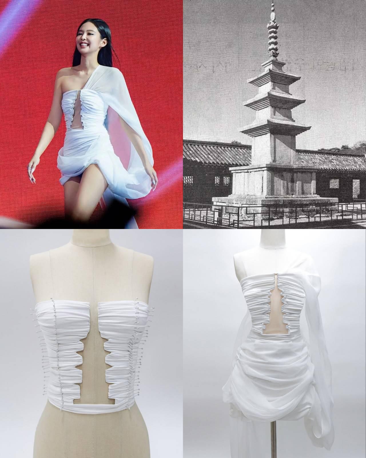 ชุดเดรสนี้ได้รับแรงบันดาลใจจากความสมดุลทางสถาปัตยกรรมของ เจดีย์ซอกกาตับ (Seokgatap) แห่งวัดบุลกุกซา โดยใช้เทคนิคการจับเดรปด้วยมือ (Hand Draping) สร้างรายละเอียดการตัดเว้า (Cut-out) เพื่อคอมพลีทลุคที่มีความหรูหราและมีความตึงผิวที่ดูประณีต