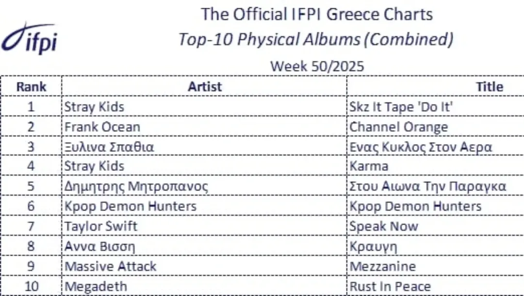 🔥 Stray Kids “DO IT” ไต่ขึ้นอันดับ 1 บนชาร์ตอัลบั้มกรีซเป็นครั้งแรกในสัปดาห์ที่ 3 ของการเปิดตัว บน Billboard/IFPI Greece Albums (สัปดาห์ที่ 50 ธันวาคม 2025) ทำให้พวกเขายังคงครองสถิติศิลปินเอเชียที่มีเพลงฮิตอันดับ 1 บนชาร์ตนี้มากที่สุดต่อไป โดยปัจจุบันมีทั้งหมด 6 อัลบั้ม