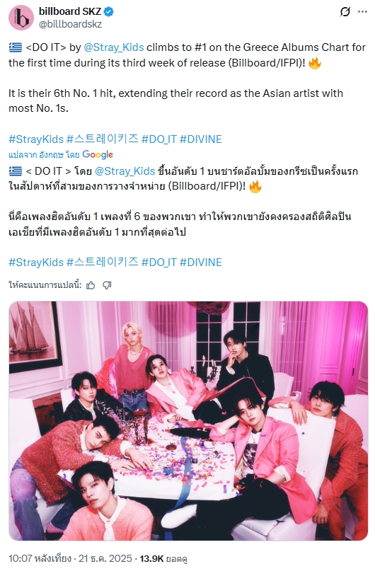 🔥 Stray Kids “DO IT” ขึ้นอันดับ 1 บน Billboard/IFPI Greece Albums ครองสถิติศิลปินเอเชียอันดับ 1 มากที่สุด 6 อัลบั้ม