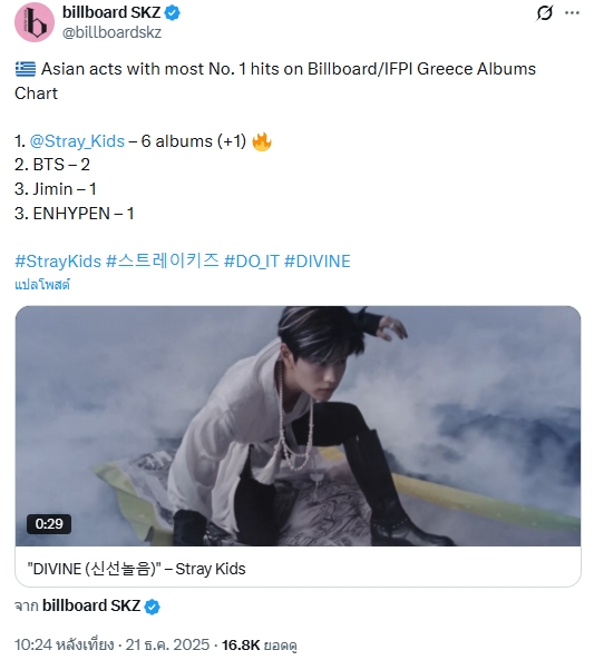 อ้างอิงกระทู้ก่อน 🔥 Stray Kids เป็นศิลปินชาวเอเชียเพียงวงเดียวที่ขึ้นอันดับ 1 มากสุดบน Billboard Greece Albums ปัจจุบันทั้งหมด 5 อัลบั้ม