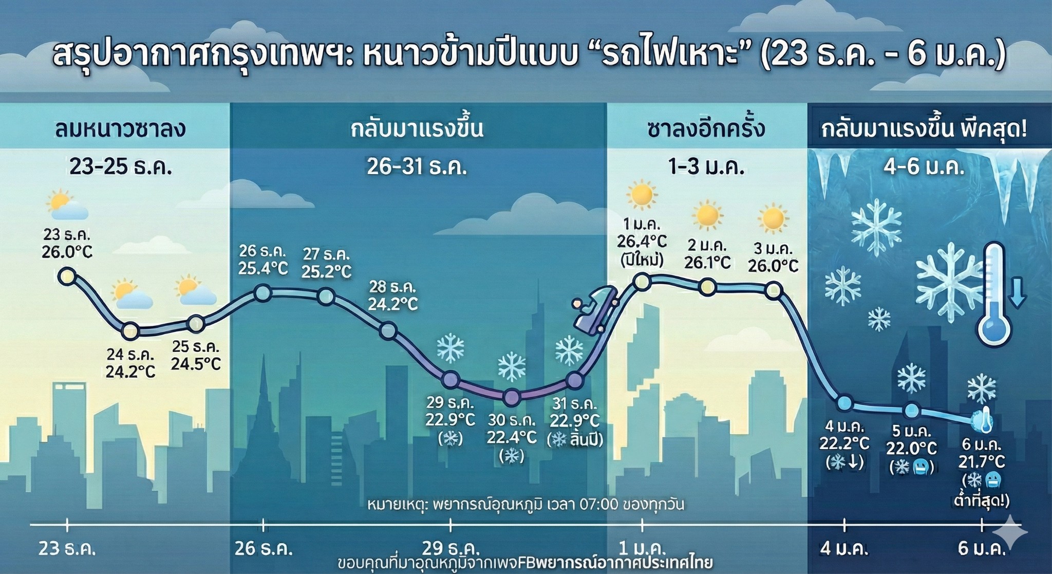 ไฮไลท์คือช่วงนี้ครับ หนาวระลอกใหม่จะมาแรงกว่าเดิม อุณหภูมิดิ่งลงชัดเจนที่สุดในรอบนี้!