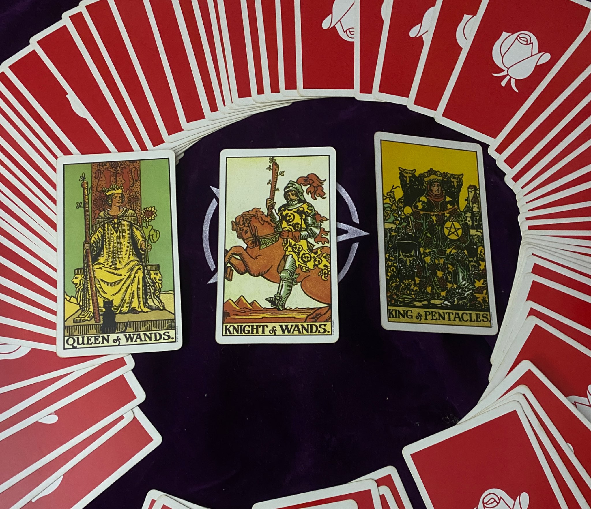 จับ 3 ใบได้ Queen of wand, Knight of wands และ King of pentacles เรียงไปค่ะ