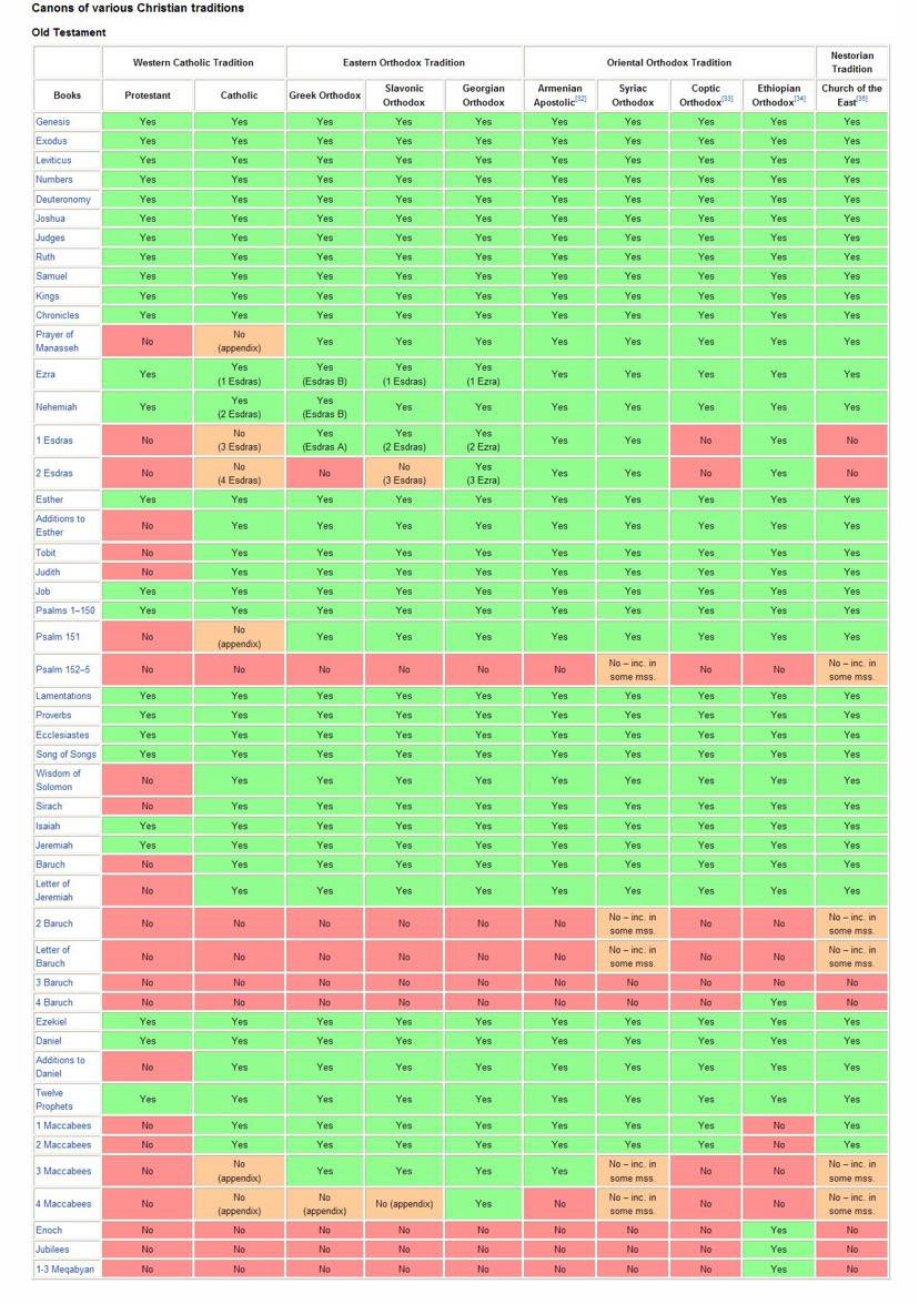 พันธสัญญาเดิม - ปฐมกาล, อพยพ, เลวีนิติ, กันดารวิถี, เฉลยธรรมบัญญัติ, โยชูวา, ผู้วินิจฉัย นางรูธ, ซามูเอล 2 ฉบับ, พงศ์กษัตริย์ 2 ฉบับ, พงศาวดาร 2 ฉบับ, เอสราและเนหะมีย์, โทบิต, ยูดีธ, เอสเธอร์, มัคคาบี 2 ฉบับ. โยบ, เพลงสดุดี, สุภาษิต, ปัญญาจารย์, เพลงซาโลมอน, ปรีชาญาณ, บุตรสิรา, อิสยาห์, เยเรมีย์, เพลงคร่ำครวญ, บารุค, เอเสเคียล, ดาเนียล, โฮเชยา, โยเอล, อาโมส, โอบาดียาห์, โยนาห์, มีคาห์, นาฮูม, ฮาบากุก, เศฟันยาห์, ฮักกัย, เศคาริยาห์, มาลาคี