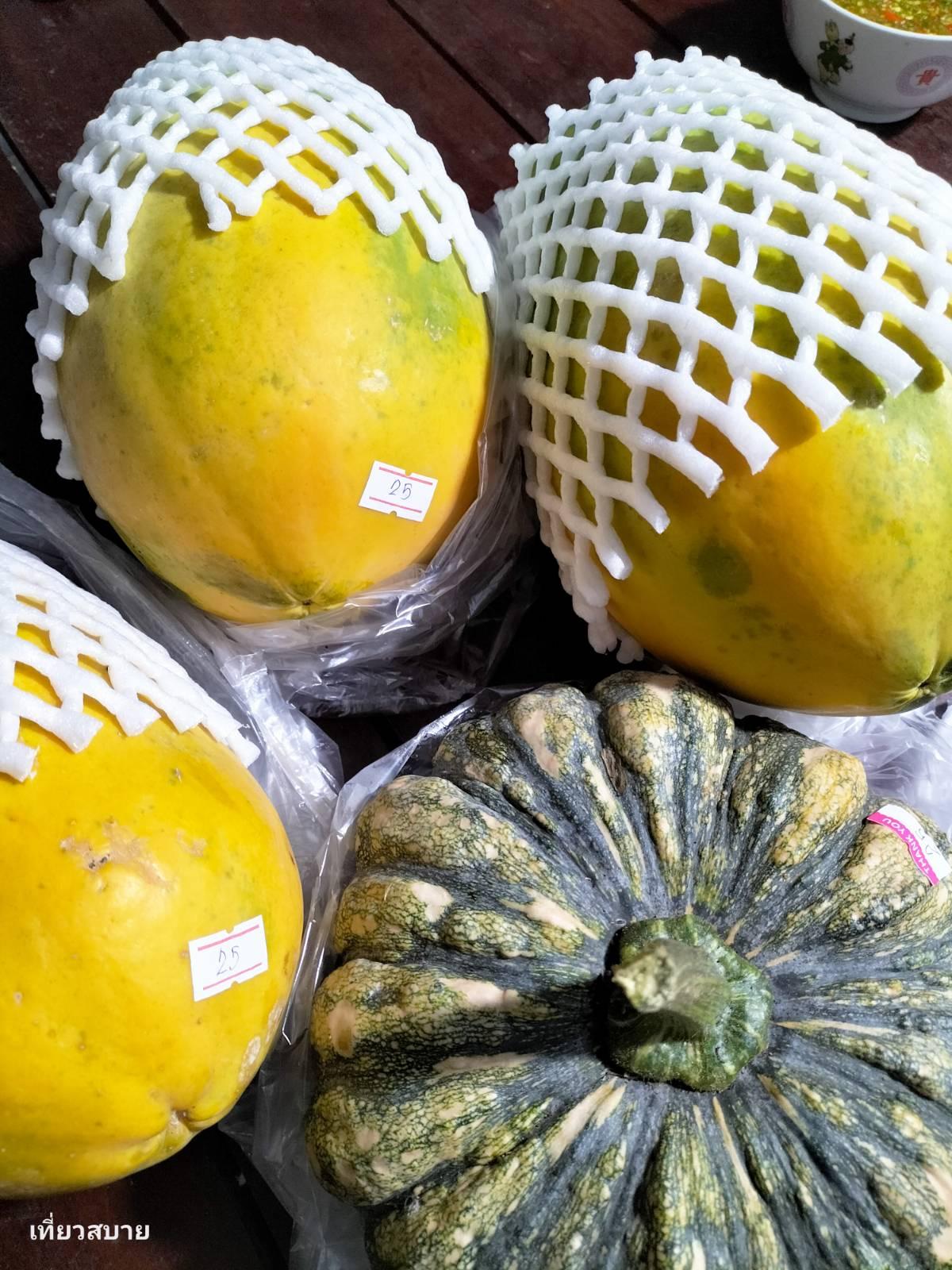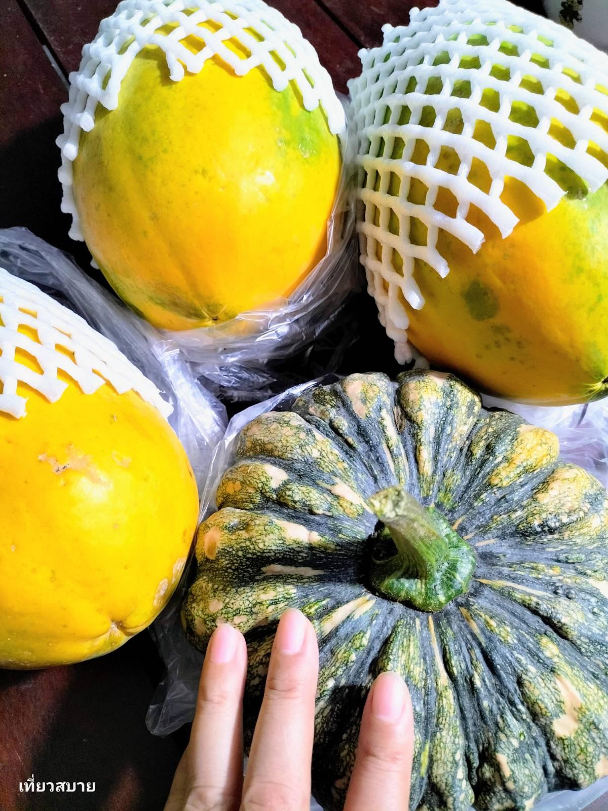 จขกท.จะชอบทานฟักทองของที่นี่มากค่ะ เนื้อเค้าเหนียวมันดี ส่วนคุณสามีชอบทานมะละกอ ก็เลยซื้อมาด้วย มะละกอ 3 ลูก ฟักทอง 1 ใบ รวมราคา 80 บาท ถูกม๊ากกกก!!