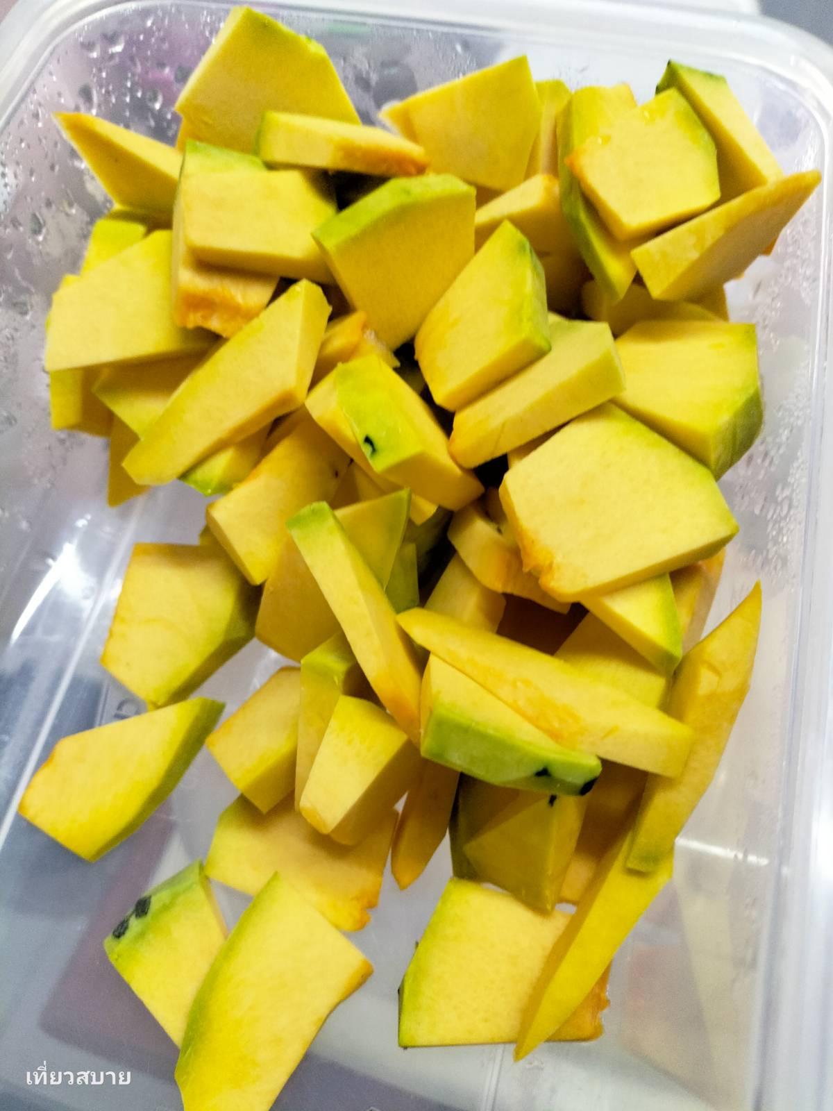 1. ฟักทอง หั่นชิ้นพอคำ ล้างให้สะอาด