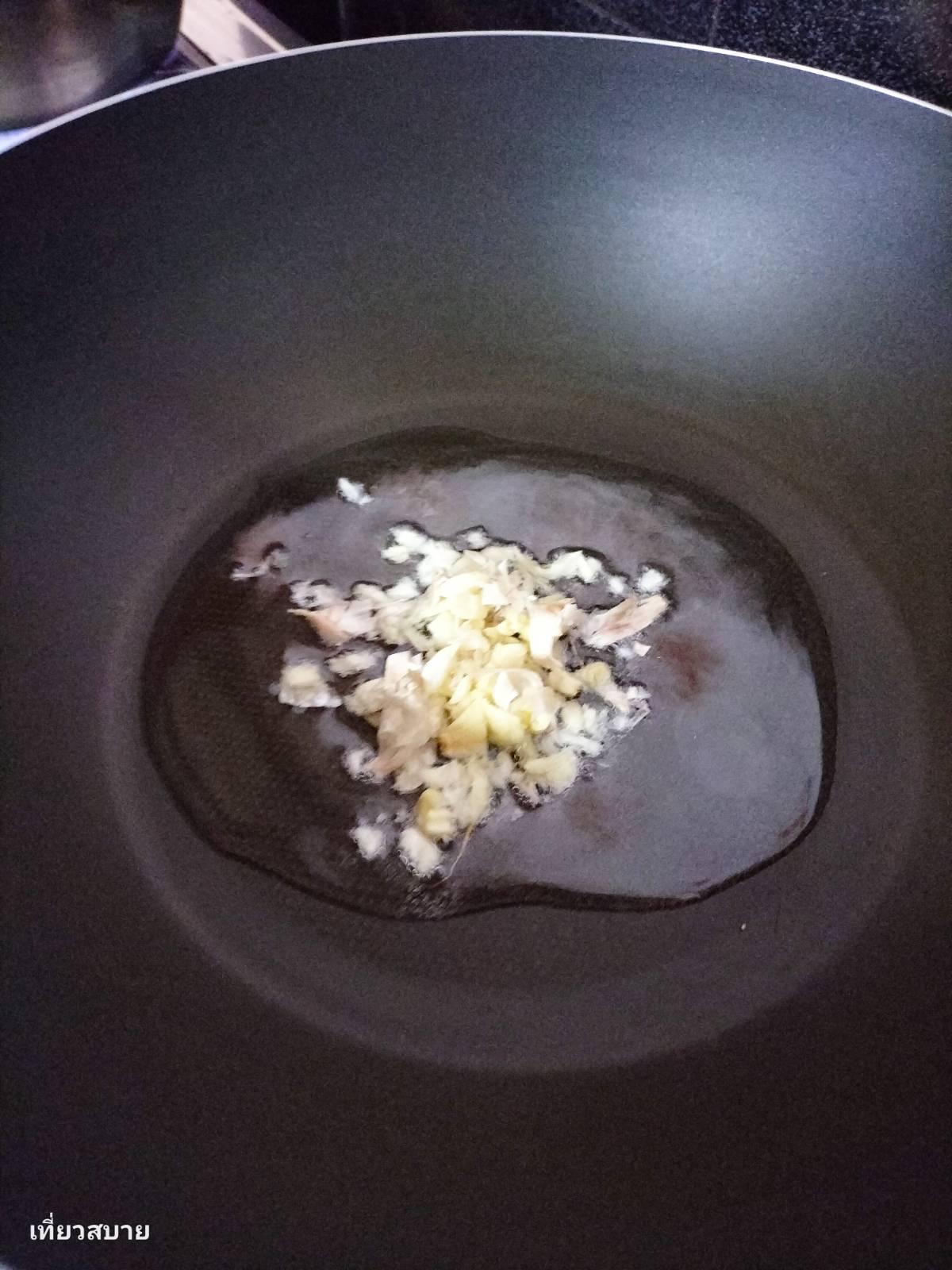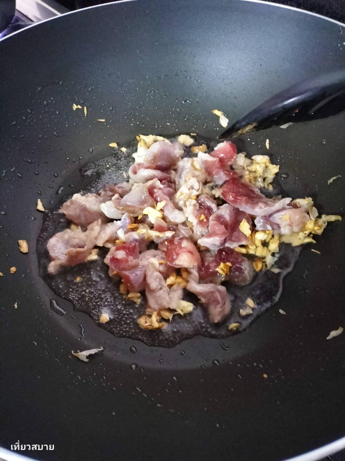 1.ตั้งกระทะเจียวกระเทียมให้หอม ใส่เนื้อหมู ที่หมักไว้ลงไปผัดพอสุก