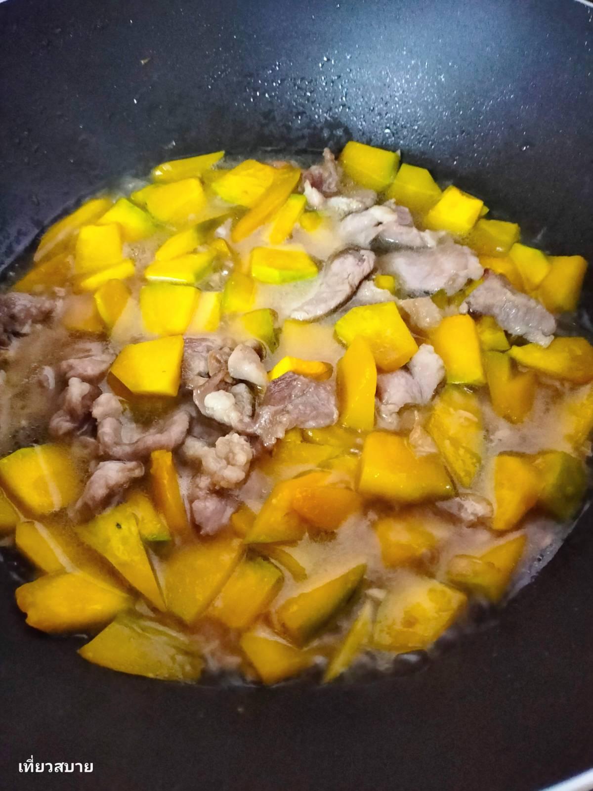 2.ใส่ฟักทองลงไปผัด ใช้ไฟกลาง ตามด้วยน้ำเปล่าพอขลุกขลิก กะให้พอดีท่วมชิ้นฟักทองนิดหน่อย เพื่อให้สุกทั่วถึง พอน้ำงวดลงก็ค่อยๆเติมน้ำลงไปอีก จนกว่าฟักทองจะสุก (ขั้นตอนนี้ จขกท.จะทำซ้ำหลายๆ ครั้ง เพราะชอบทานฟักทองแบบนิ่มๆ เหนียวๆ ค่ะ )