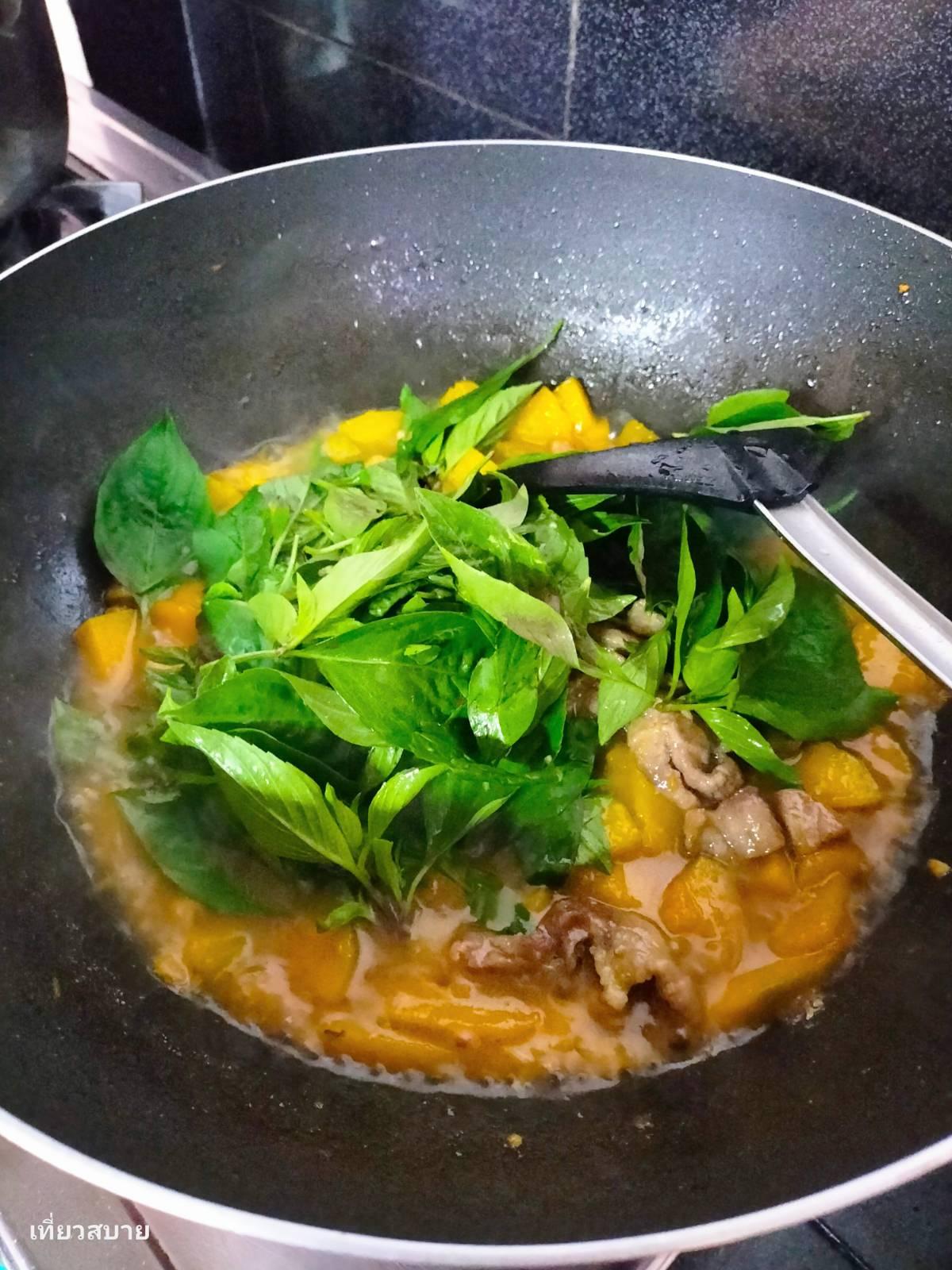 3.พอฟักทองเริ่มสุกได้ที่ปรุงรสด้วยน้ำมันหอย น้ำปลา น้ำตาลทรายเล็กน้อย ชิมรสให้ได้ตามชอบ ใส่ใบโหระพา โรยพริกไทยลงไป ปิดไฟ เป็นอันเสร็จพิธีค่ะ