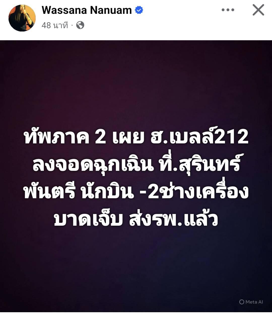 เมื่อช่วงเย็นที่ผ่านมา เฮลิคอปเตอร์แบบ Bell 212 ของกองทัพบกไทยได้ประสบเหตุจำเป็นต้องลงฉุกเฉิน ระหว่างปฏิบัติภารกิจชายแดนไทย-กัมพูชา จ.สุรินทร์ ส่งผลให้มีกำลังพลบาดเจ็บจำนวน 4 นาย