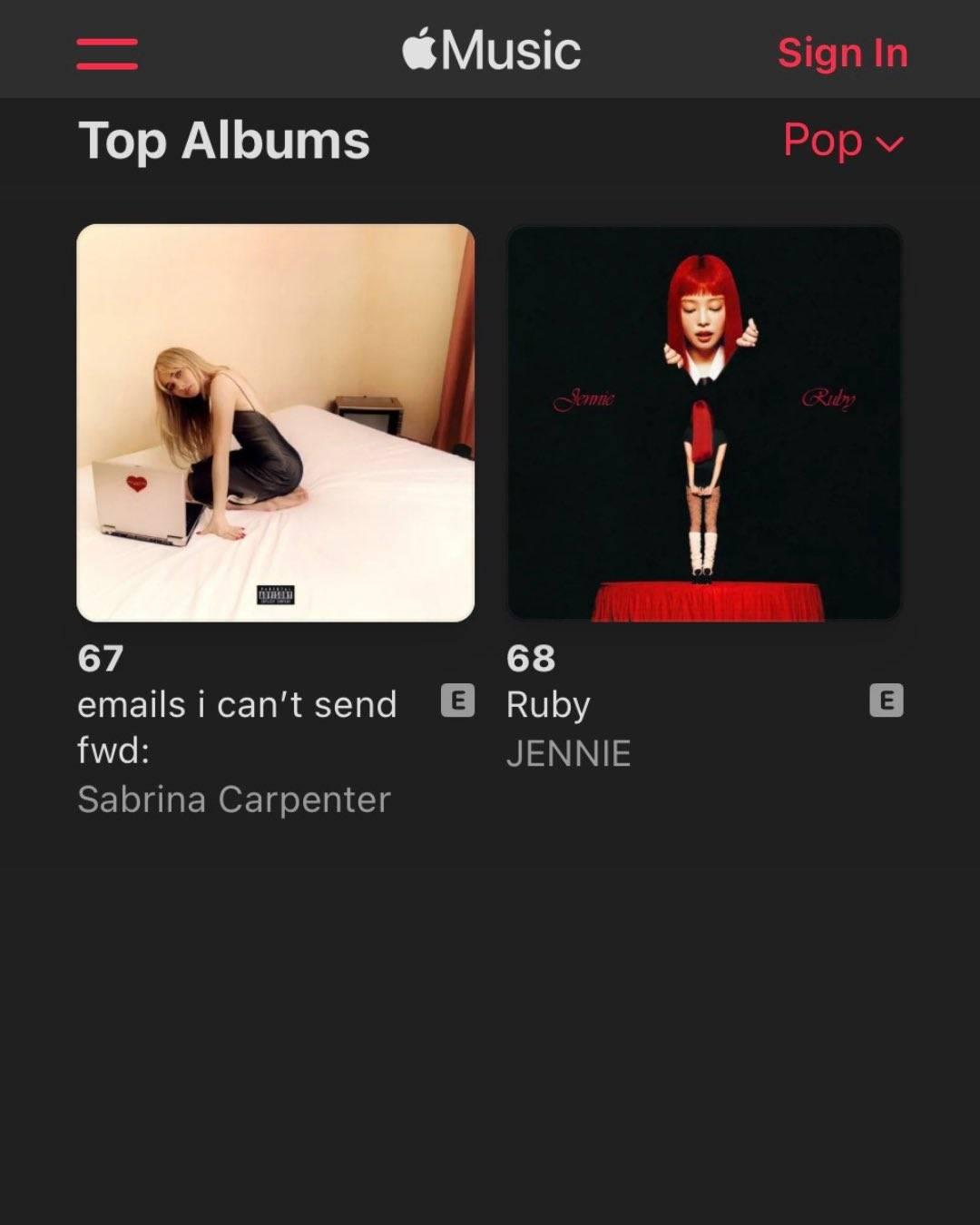 อัลบั้ม “Ruby” ของ JENNIE ไต่ขึ้นสู่อันดับที่ 68 (+27) บนชาร์ตอัลบั้มเพลงป็อปของ Apple Music สหรัฐอเมริกาอีกครั้ง หลังจากที่เมื่อวานกลับเข้าท็อป 100 ที่อันดับที่ 95 โดยเจนนี่เคยทำอันดับพีคสุดที่อันดับ 9 สูงที่สุดของศิลปินเดี่ยว K-POP บนชาร์ตนี้