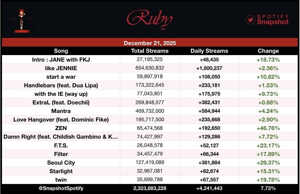 อัลบั้ม "Ruby" ของ JENNIE มียอดสตรีมบน Spotify เมื่อวานนี้ 4,241,443 ครั้ง [+7.73%]